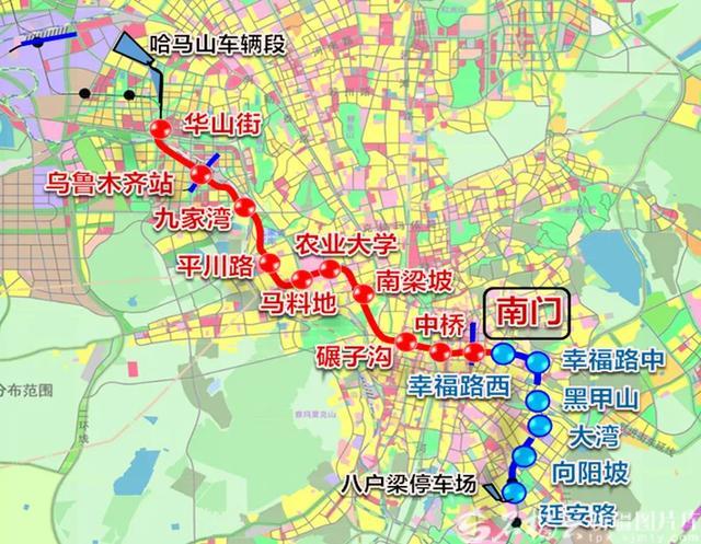 乌鲁木齐地铁2号线建设工作2016年启动,南起延安路站,北至华山街站,全长19.35公里,2号线北段全长13.94公里,设南门、中桥、碾子沟、南梁坡、农业大学、马料地、平川路、九家湾、乌鲁木齐站、华山街10座车站。