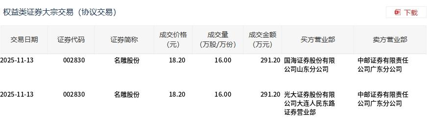 11月13日,名雕股份大宗交易成交32万股,成交额582.4万元,占当日总成交额的10.24%,成交价18.2元,较市场收盘价18.53元折价1.78%。