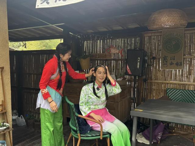 “哎嗨哟!山花开满坡哟!”11月11日午后,石台县大演乡白石岭古村落被阳光晒得暖洋洋,韩国籍自媒体博主白瑞禧穿着一身绿色碎花的传统服饰,石台民歌市级非遗传承人涂桂萍正站在她身旁,手指灵巧地将她的长发分成三股,一边轻柔地编着辫子,一边慢悠悠地教她唱民歌。“第一次唱这种调子,像泉水流过石头的声音!”学完一段,她抬手摸了摸刚编好的辫子,又对着镜头整理服饰的领口:“你们看这个纹样,特别精致!我已经发了Ins,评论区都在问我‘这是中国哪里’!”