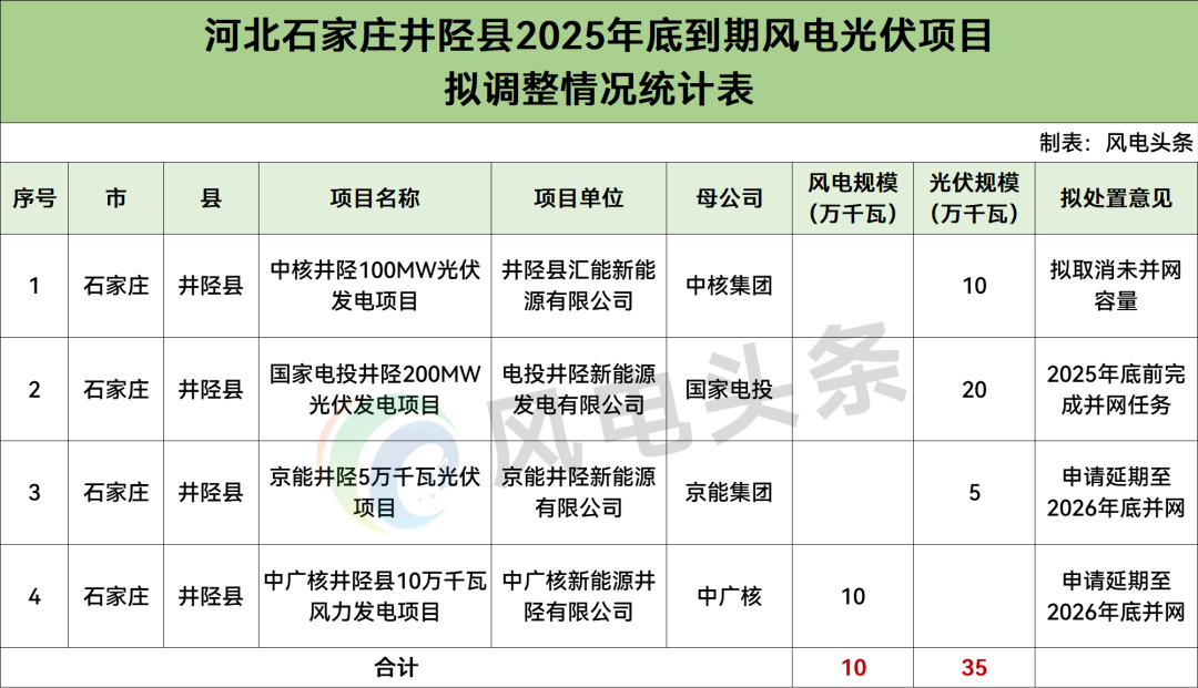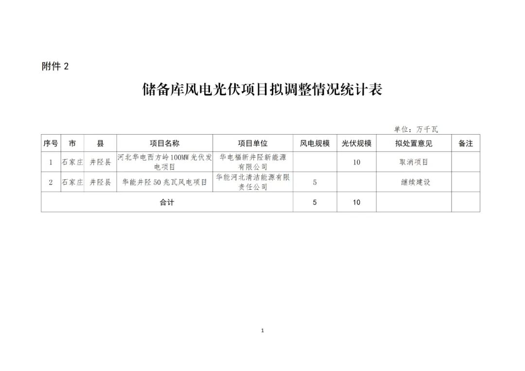 为进一步加强风电、光伏发电项目管理,我局组织对井陉县2025年底到期未建成风电光伏项目和储备库风电光伏项目情况进行了摸底,并结合企业投资积极性、土地资源落实情况、项目前期手续办理及施工进度等研究提出了处置意见。现将相关项目拟调整意见予以公示。具体项目名单及调整意见见附件。