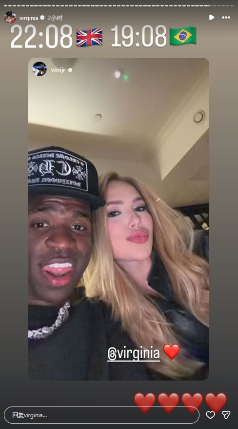 本场比赛,维尼修斯女友弗吉尼亚身穿巴西7号球衣前往现场观战。赛后维尼修斯晒出了与弗吉尼亚的合照。