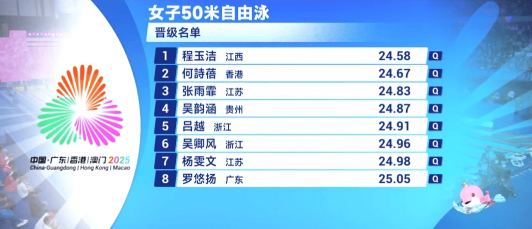 全运会女子50米自由泳:程玉洁、何诗蓓&张雨霏前三晋级决赛