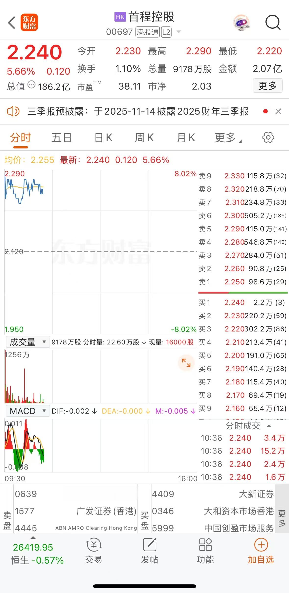 财报显示,首程控股前三季度收入同比增长30%至12.15亿港元,归母净利润同比增长22%至4.88亿港元。