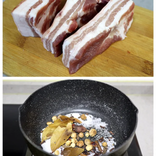 2. 腌肉料入锅中,小火烤微焦出香味;