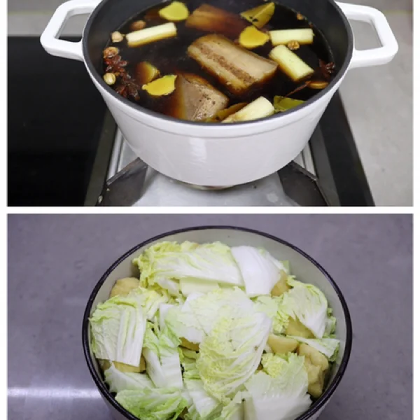 8. 炖肉的时候准备一下菜底:将白菜切大块,油豆腐撕小口,将白菜和油豆腐花搭着码放在阔口碗中;