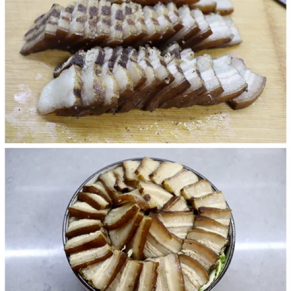 10. 将炖肉汁过筛去残渣,肉汤倒菜碗中,表面铺码五花肉片;