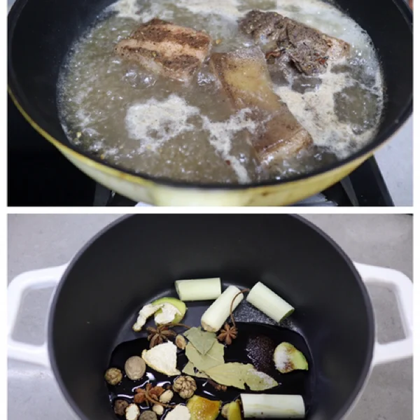 5. 将腌好的肉块入凉水锅中煮开,上面有些腌肉料的末末也不要紧,带着它更入味,
