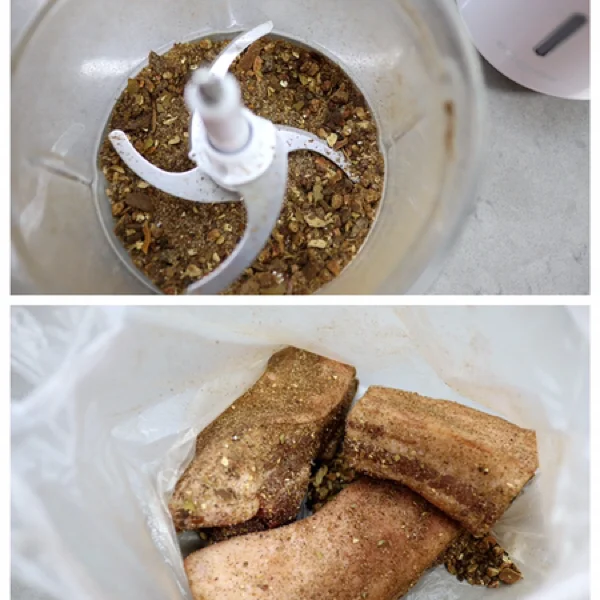 3. 将晾凉的腌肉料入料理机中,打成碎末;