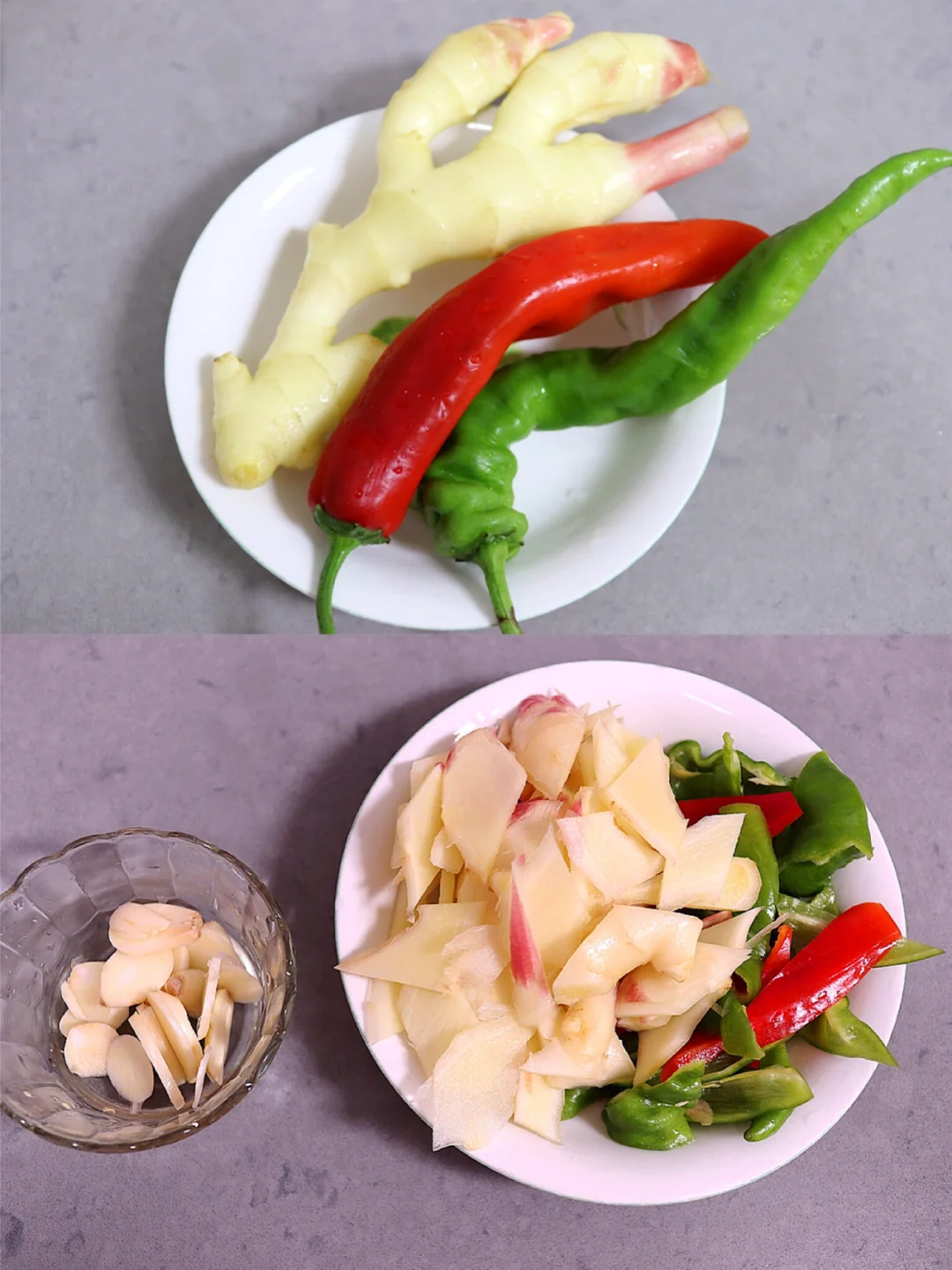 3. 鲜姜1大块,用量可多些,青红辣椒各一个;