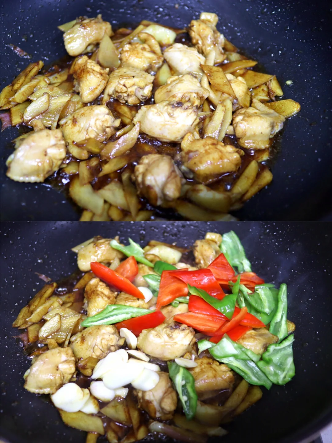 8. 翻炒均匀后将青红辣椒块和蒜片倒入锅中,青红辣椒蒜片都可以生吃,放在里面有配色调味之用,所以混合均匀即可出锅。