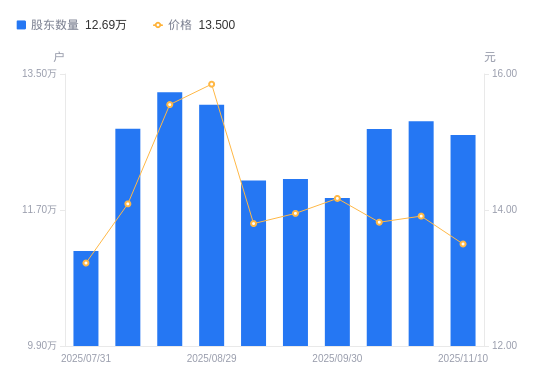 日期A股户数(户)流通A股户均持股数(股)户均持股市值(万元)2025-11-101269139579.2112.932025-10-311287329443.8513.142025-10-201277159519.0513.162025-09-3011859510251.0714.532025-09-1912109710039.2714.002025-09-1012090210055.4613.882025-08-291309219285.9514.722025-08-201325949168.7814.262025-08-081277519516.3713.412025-07-3111156210897.3114.41