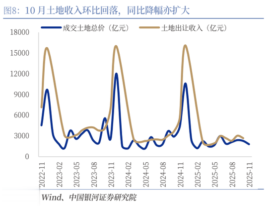 政府性基金收入方面,土地收入环比回落,同比降幅亦显著扩大。1-10月政府性基金收入累计增速-2.8%(前值-0.5%),降幅有所走阔,或与10月份土地市场热度回落有关。10月土地出让收入当月值为2680亿元(前值3039亿元),累计增速下滑至-7.4%(前值-4.2%),土地成交规模环比回落,同比降幅亦显著扩大。根据克而瑞地产研究数据,10月土地成交建筑面积与金额分别环比下降13%和20%;同比来看,二者降幅进一步扩大至25%和33%,均创下年内最高同比跌幅。不过从土地成交规模收缩的实际情况来看,当前地方土地市场供求已处于更合理的规模水平。