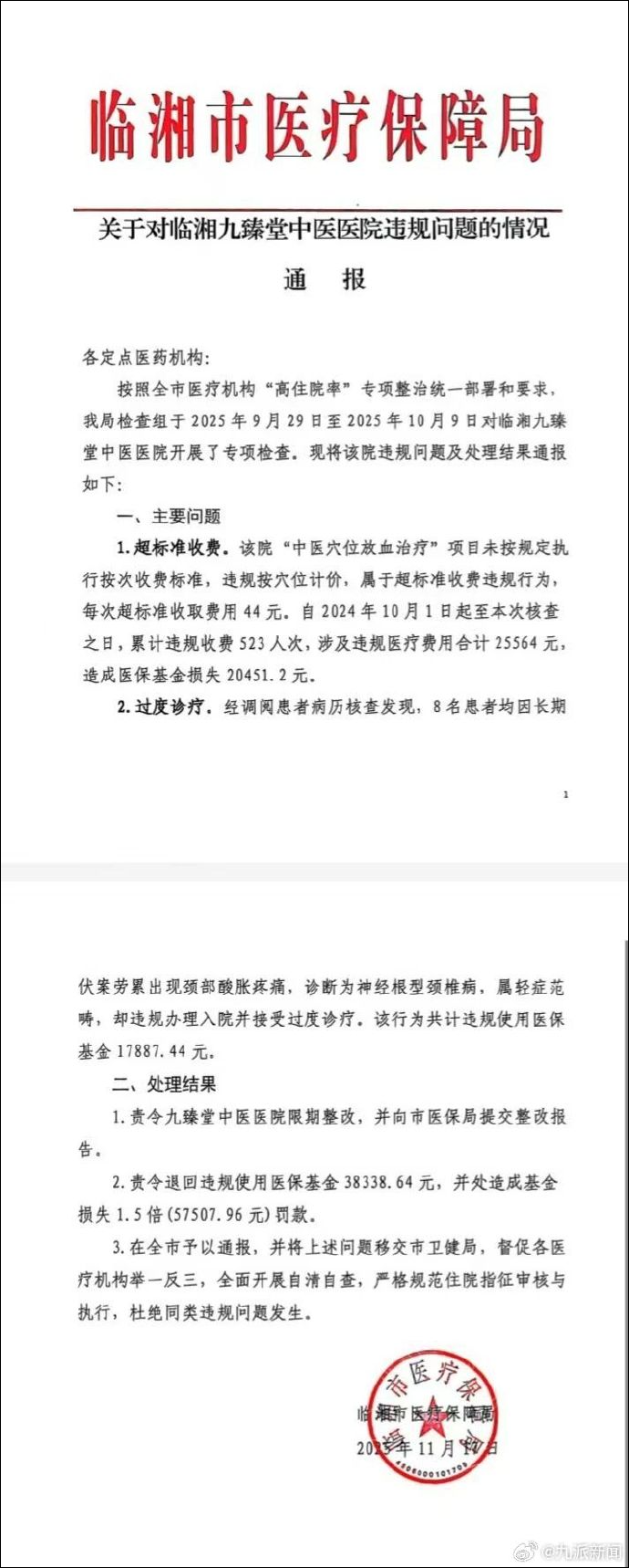 11月18日,湖南岳阳临湘医疗保障局微信公众号发布《关于对临湘九臻堂中医医院违规问题的情况通报》: