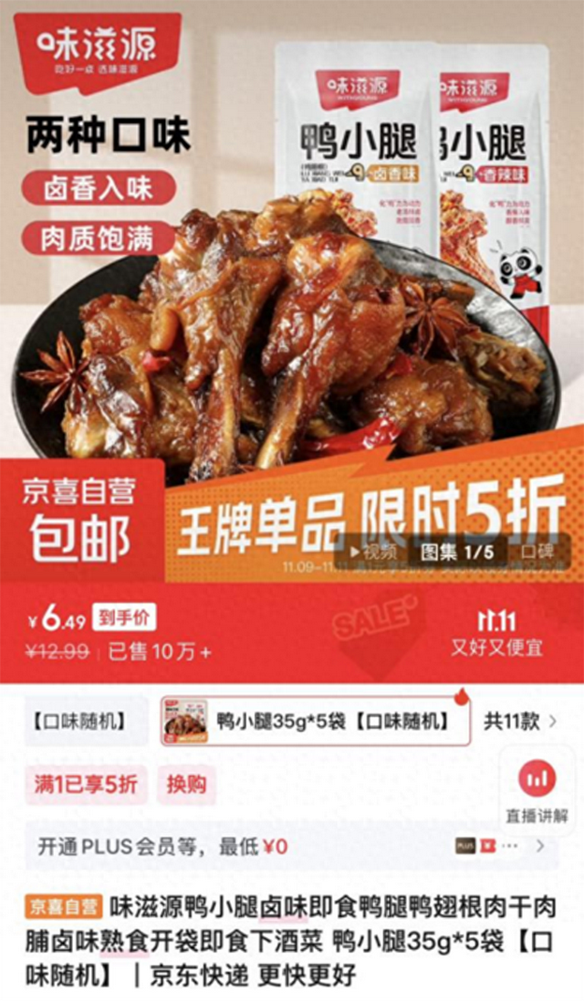 京东11.11休闲零食销售火热京喜自营鸭小腿28小时卖出1.5万袋