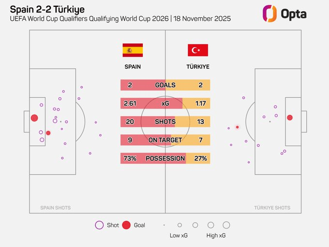 虎扑11月18日讯世界杯欧洲区预选赛,西班牙2-2战平土耳其。