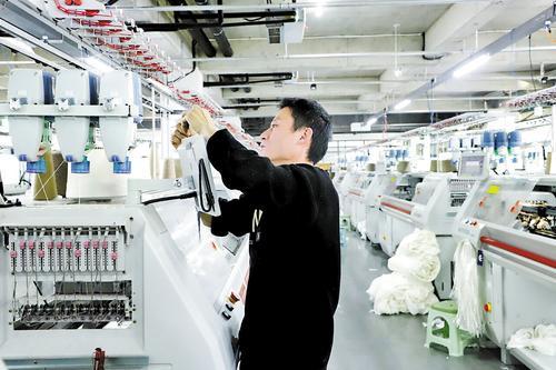10月29日,在清河国际羊绒高端针织产业园数字化共享工厂,工人正在检查设备。曹庆隆摄