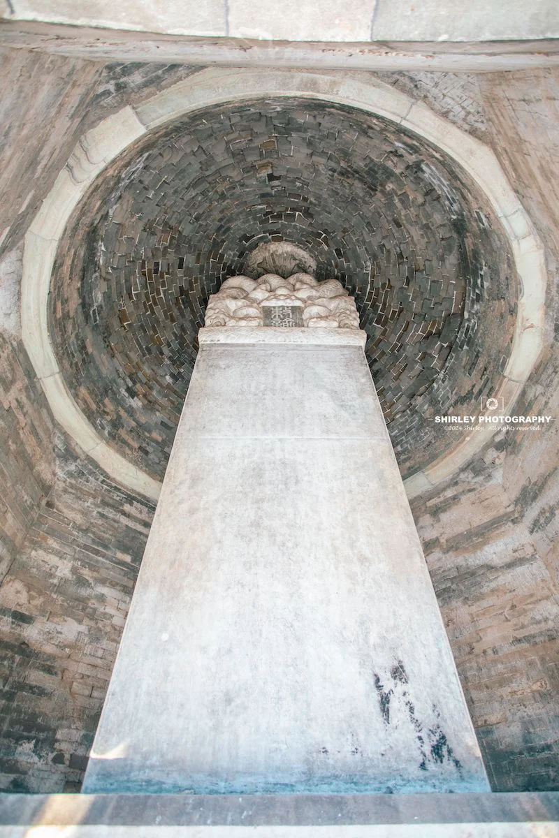 ▫️三座并立的砖石碑亭是墓园一大亮点,碑刻记录田义生平功绩,明代石质盘龙藻井雕刻细腻。