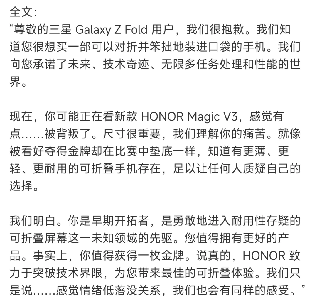 继苹果之后,荣耀怼上三星,在荣耀Magic V3的中框上刻上了166字“致敬”先驱三星折叠屏:“尺寸很重要,我们理解你的痛苦。就像被看好夺得金牌却在比赛中垫底一样,知道有更薄、更轻、更耐用的可折叠手机存在,足以让任何人质疑自己的选择。”。 全文比较长看图2,第二季度荣耀折叠屏在西欧打败三星,这次更是火力全开了,不知道三星会怎么回应呢?