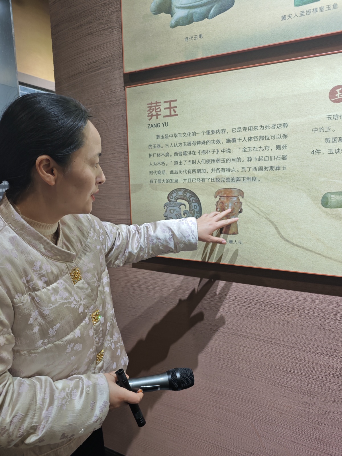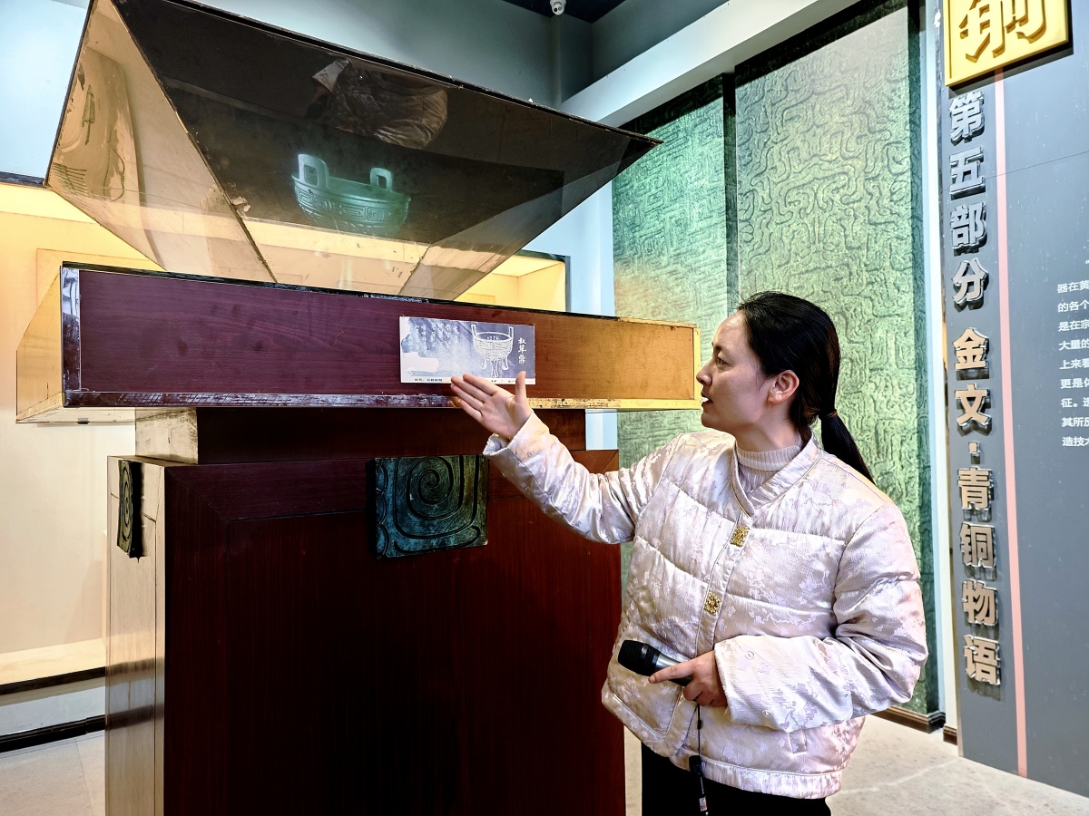 汪倩又指着铜盉、青铜壶等文物复制品介绍说:“这些器物均出土于光山宝相寺黄夫人墓,它们工艺精湛、铭文清晰,令人叹为观止。”