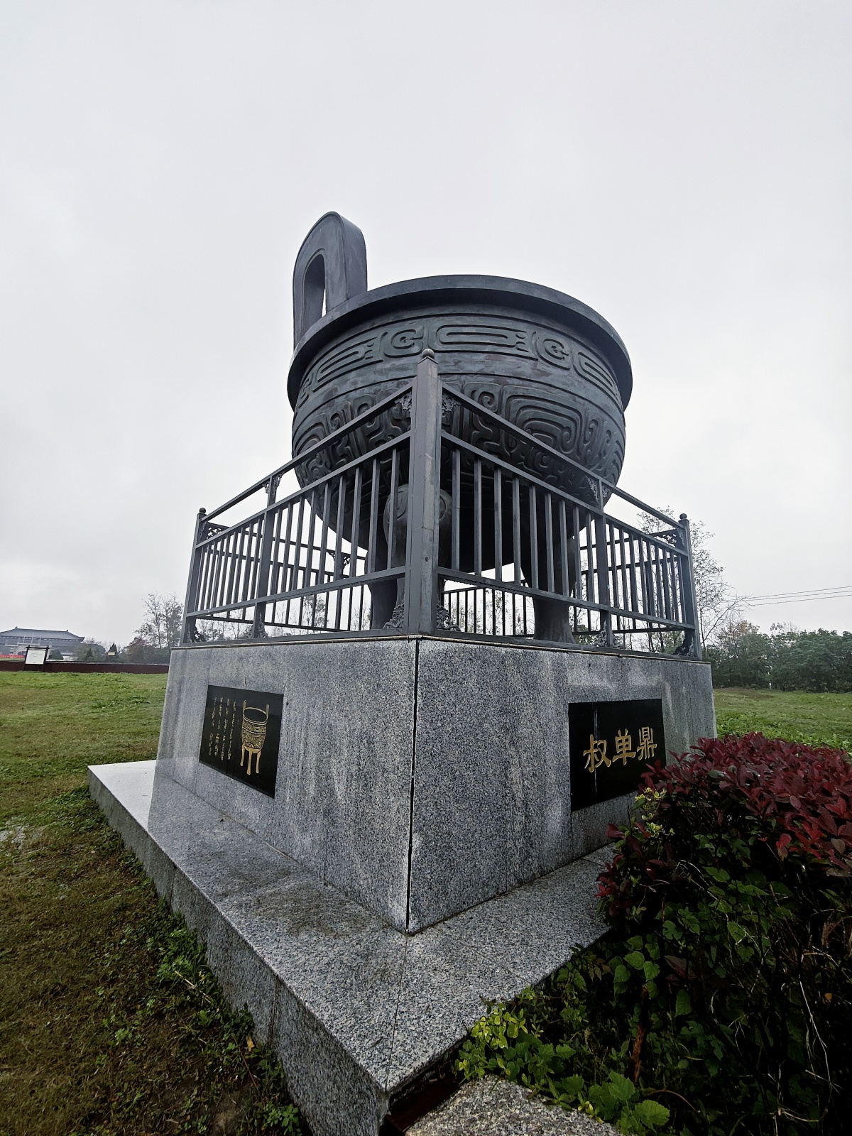 继续前行,抬眸望去,通往一处高台的步梯尽头,分立着两座巍峨巨鼎,原型为叔单鼎,是其12.5倍放大的复制品。原鼎1932年出土于潢川。
