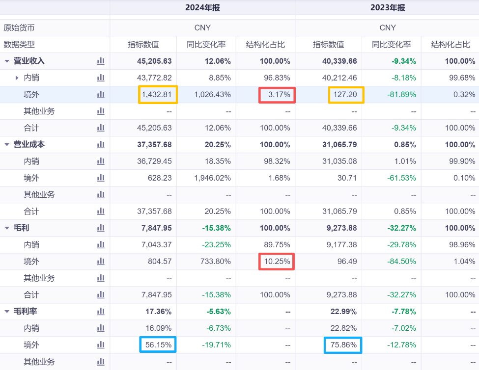 成果也直接反映在财报中:公司境外收入从2023年的127万元跃升至2024年的1433万元,毛利率更是分别高达75.86%、56.15%,显著高于公司整体20%左右的水平。尽管2024年境外收入占比仅3.17%,却贡献了10.25%的毛利,成为盈利结构优化的关键推力。