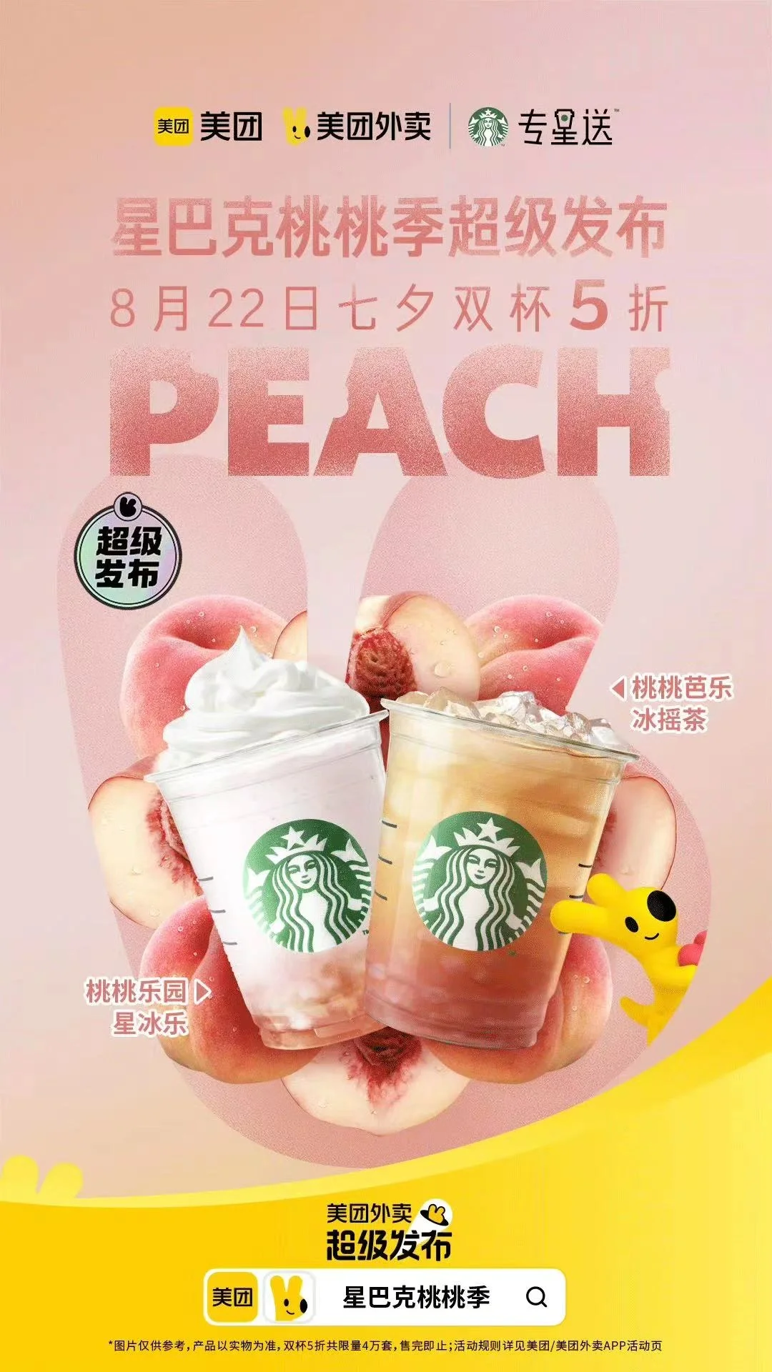 别再犹豫了,桃桃带来的甜蜜七夕,快打开美团外卖,让星巴克为你带来清凉与甜蜜。