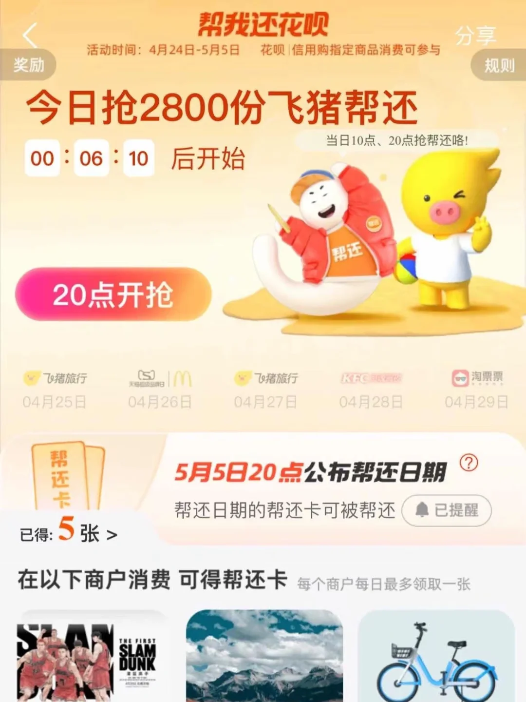 🌟省钱攻略:进店点菜前可以先问问有没有团购或者买单优惠。景点门票也可以在网上提前购买,通常都有优惠,更划算。4.24、4.25、4.27在飞猪用花呗订机票和境内酒店,再上zfb搜【花🌸呗🌸帮🌸还🌸】,在活动页面可以抢z高30元帮还红包。三天就是小100!同时,5 月 5 日前,每天在飞猪用花呗消费,都能得帮还卡,参与 5 月 5 日的集中开大奖!让你的五一假期一边玩一边省钱🦙!