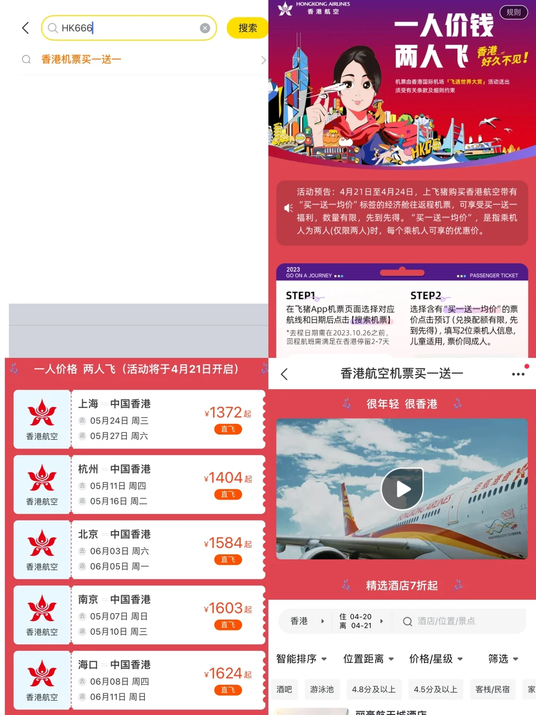 🌟4月21日⏰早上10点开始👉至4月24日上飞🐷搜🔎“HK666”,购买航班日期在10.26前的香港航空带有“买一送一均价”标签的航班,即可有机会享机票买一送一,还能叠加最高120元、50元大面额优惠券,数量有限,先到先得!