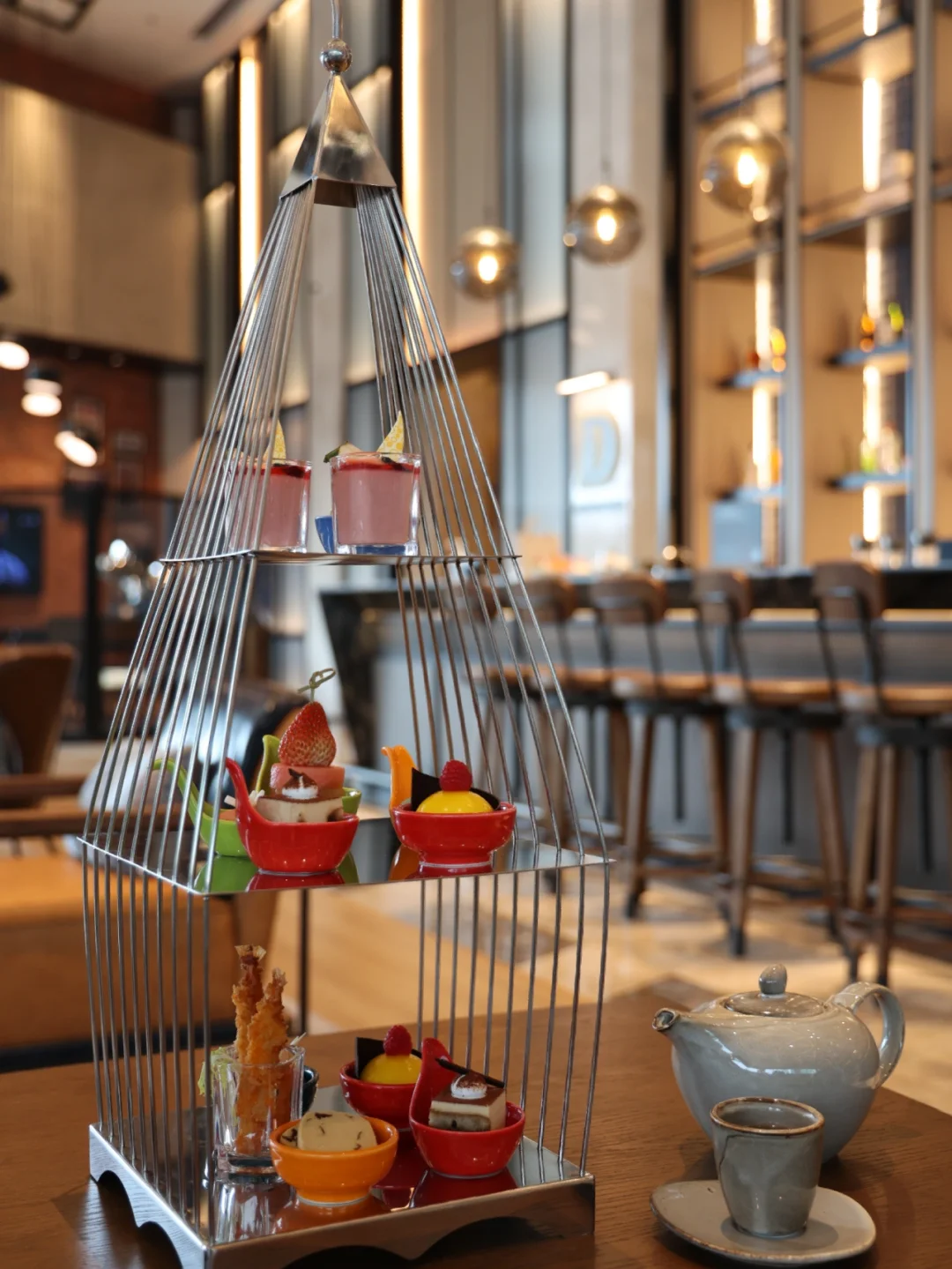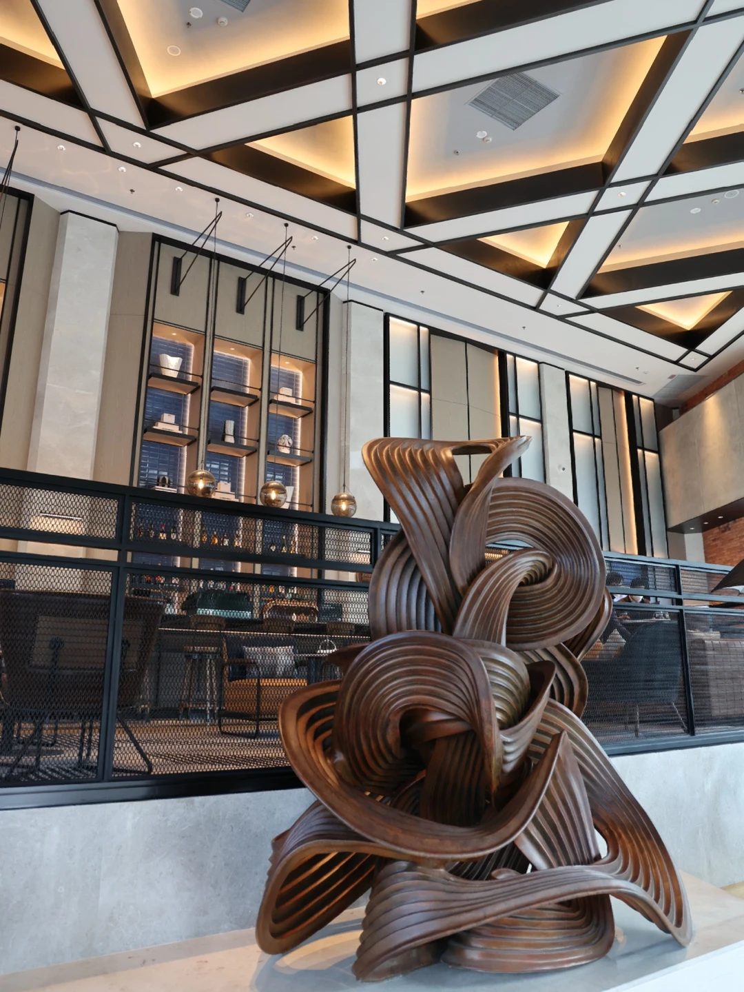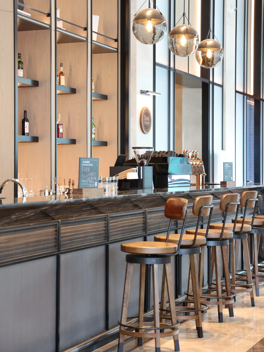 ✨一进酒店首先映入眼帘的是大堂吧,大堂入口木质装饰醒狮复古的同时独具广府特色。大堂吧中央两排超高酒柜搭配莫兰迪色块配色,凸显空间的轻工业风格。在这里享受下午茶时光或者晚上一同畅享本地精酿是休闲聚会和商务洽谈的理想空间。