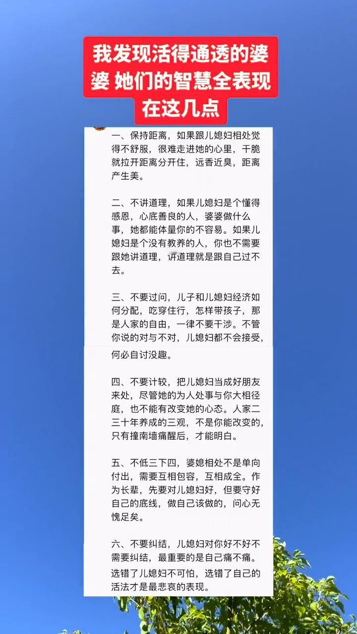 我发现活得通透的婆婆在这几点。 ·一、保持距离。如果跟儿媳妇相处觉得不舒服,很难走进她的心里,干脆就拉开距离分开住,远香近臭,距离产生美。 ·二、不讲道理。如果儿媳妇是个懂得感恩,心底善良的人,婆婆做什么事,她都能体量你的不容易。如果儿媳妇是个没有教养的人,你也不需要跟她讲道理,讲道理就是跟自己过不去。 ·三、不要过问。儿子和儿媳妇经济如何分配,吃穿住行,怎样带孩子,那是人家的自由,一律不要干涉。不管你说的对与不对,儿媳妇都不会接受,何必自讨没趣。 ·四、不要计较。把儿媳妇当成好朋友来处,尽管她的为人处事与你大相径庭,也不能有改变她的心态。人家二三十年养成的三观,不是你能改变的。只有撞南墙痛醒后,才能明白。 ·五、不低三下四。婆媳相处不是单向付出,需要互相包容,互相成全。作为长辈,先要对儿媳妇好,但要守好自己的底线,做自己该做的,问心无愧足矣。 ·六、不要纠结。儿媳妇对你好不好不需要纠结,最重要的是自己痛不痛。选错了儿媳妇不可怕,选错了自己的活法才是最悲哀的表现。