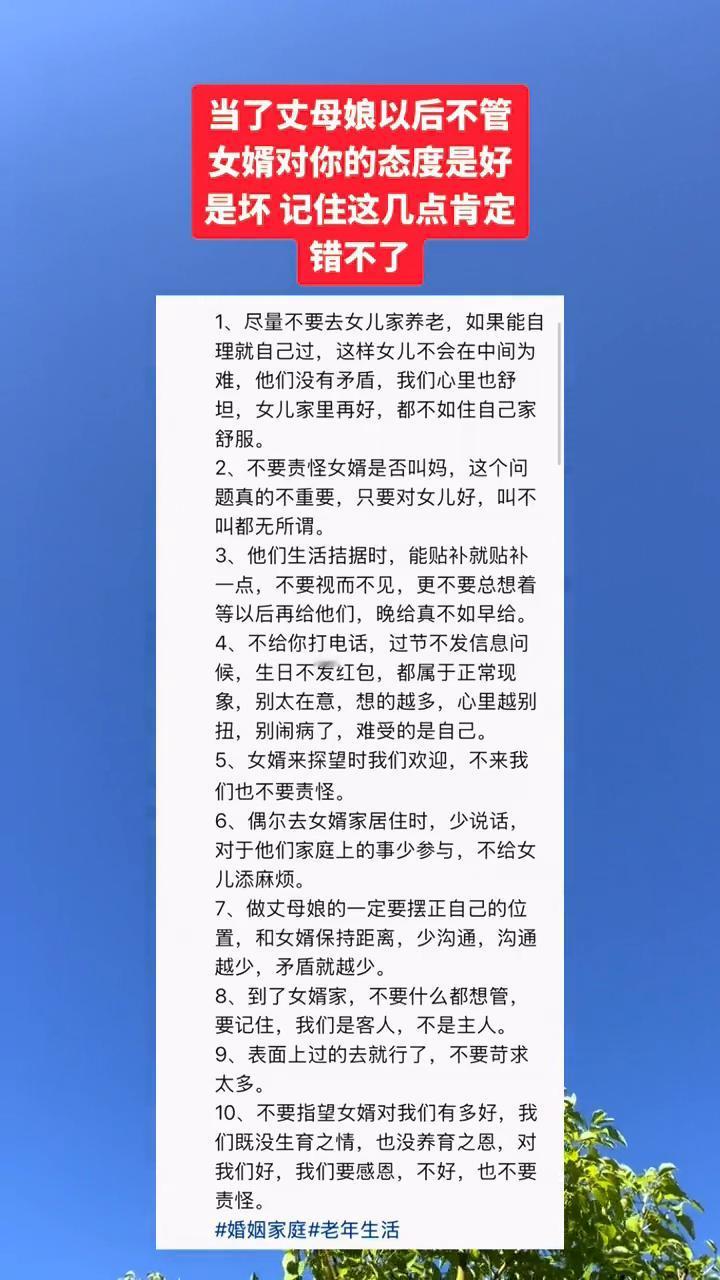 当了丈母娘以后不管女婿对你的态度是好是坏,记住这几点肯定错不了。 ·1、尽量不要去女儿家养老,如果能自理就自己过,这样女儿不会在中间为难,他们没有矛盾,我们心里也舒坦,女儿家里再好都不如住自己家。 ·2、不要责怪女婿是否叫妈,这个问题真的不重要,只要对女儿好叫不叫妈。 ·3、他们生活拮据时能贴补就贴补一点,不要视而不见,更不要总想着等以后再给他们,晚给真不如早给。 ·4、不给你打电话,过节不发信息问候,生日不发红包都属于正常现象,别太在意,想的越多心里越别扭,别闹病了难受的是自己。 ·5、女婿来探望时我们欢迎,不来我就不来。 ·6、偶尔去女婿家居住时少说话,对于他们家庭上的事少参与,不给女儿添麻烦。 ·7、做丈母娘的一定要摆正自己的位置,和女婿保持距离,少沟通,沟通的越久越好。 ·8、到了女婿家不要什么都想管,要记住我们是客人不是主人。 ·9、表面上过的去就行了,不要苛求。 ·10、不要指望女婿对我们有多好,我们既没生育之情也没养育之恩,对我们好我们要感恩,不好也不要强求。
