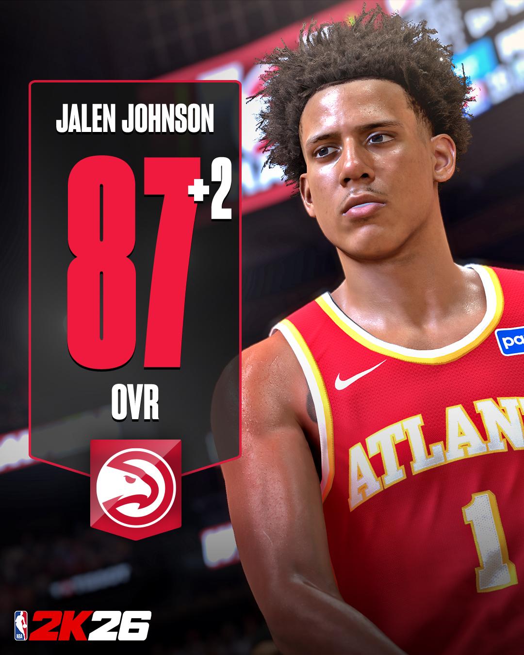 如图所示,杰伦-约翰逊2K26的能力值提升了2个点,来到了87。