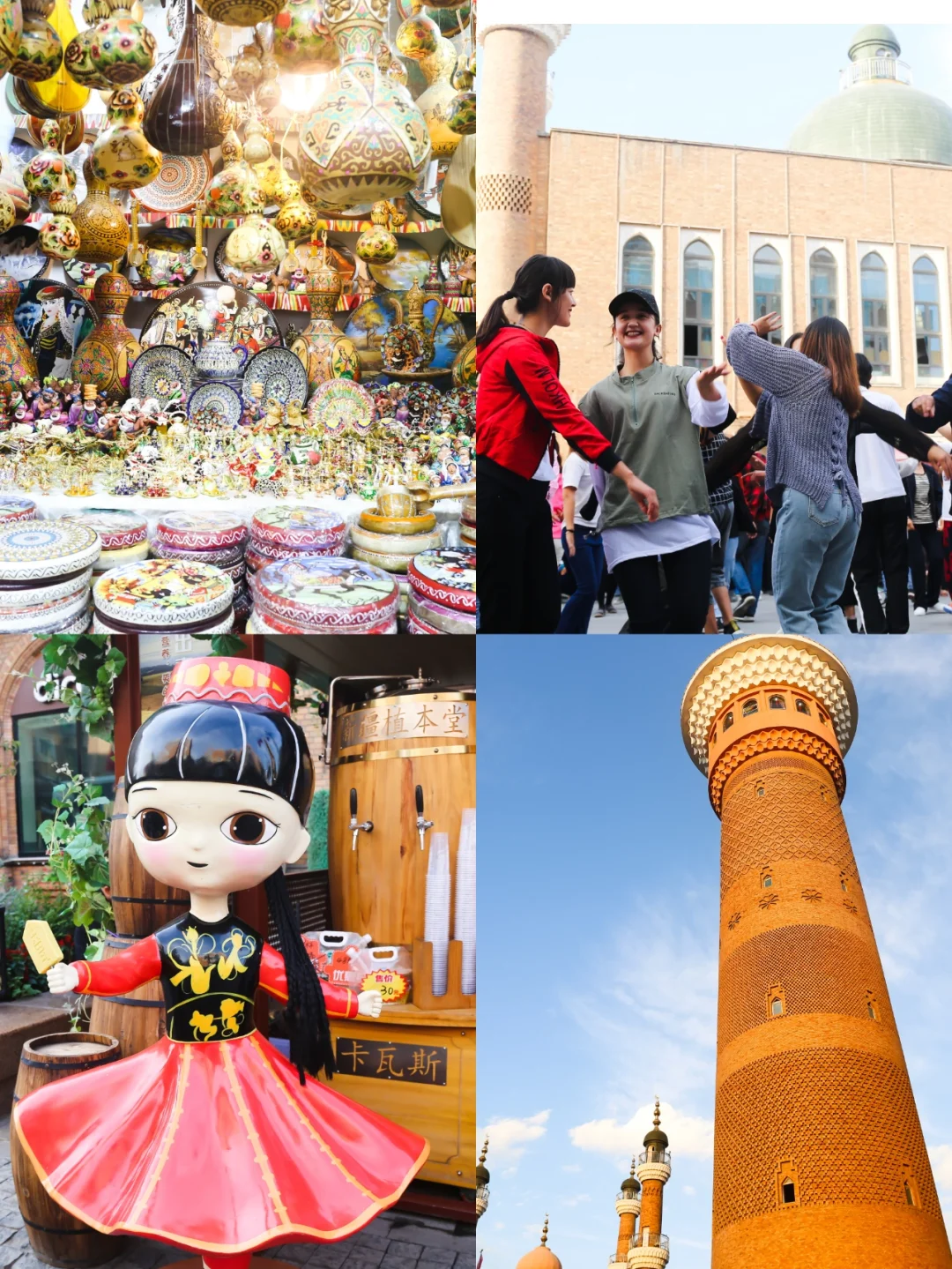 第1⃣天 早上到二道桥大巴扎,喝格瓦斯,与当地人在广场一起跳舞,在美食广场体验当地美食酸奶,米肠,面肺子。下午到红山公园,站在高处俯瞰乌鲁木齐城景。