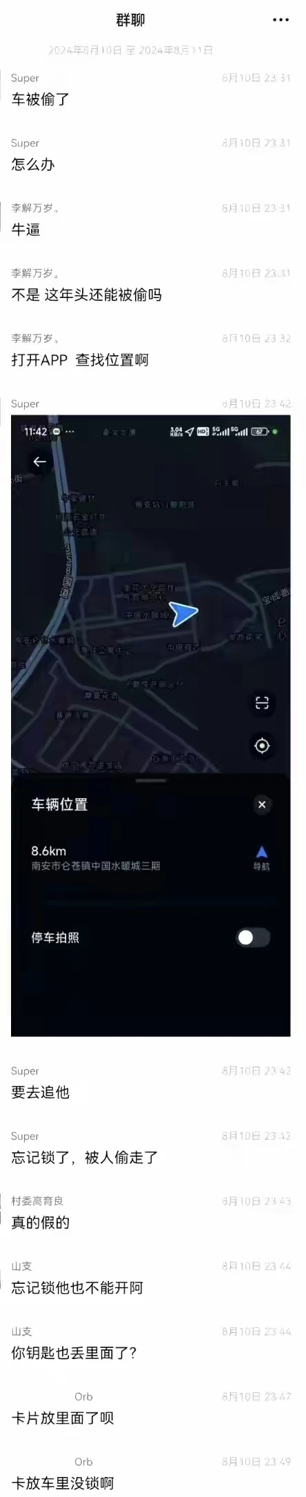有个小米SU7的车主说车被偷了,车钥匙放车里没锁车,然后在群友的帮助下,打开APP定位功能,成功拦截到车,估计要上热搜了。二十几年前我哥的一辆雅阁也被偷过,当时信息网络不发达,怎么都找不回来,现在都什么年代了,还有人偷车,真当摄像头是摆设的?真不通怎么想的?我估计是年轻人作案,蹲一个后续。