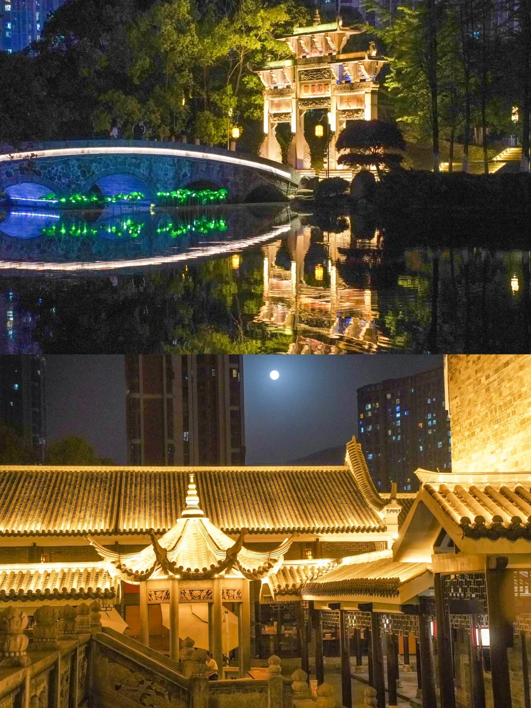 ✅爱莲湖公园:晚上一定要来!灯光亮起,湖水波光粼粼,古桥、楼阁倒映水中,散步消食氛围感拉满~