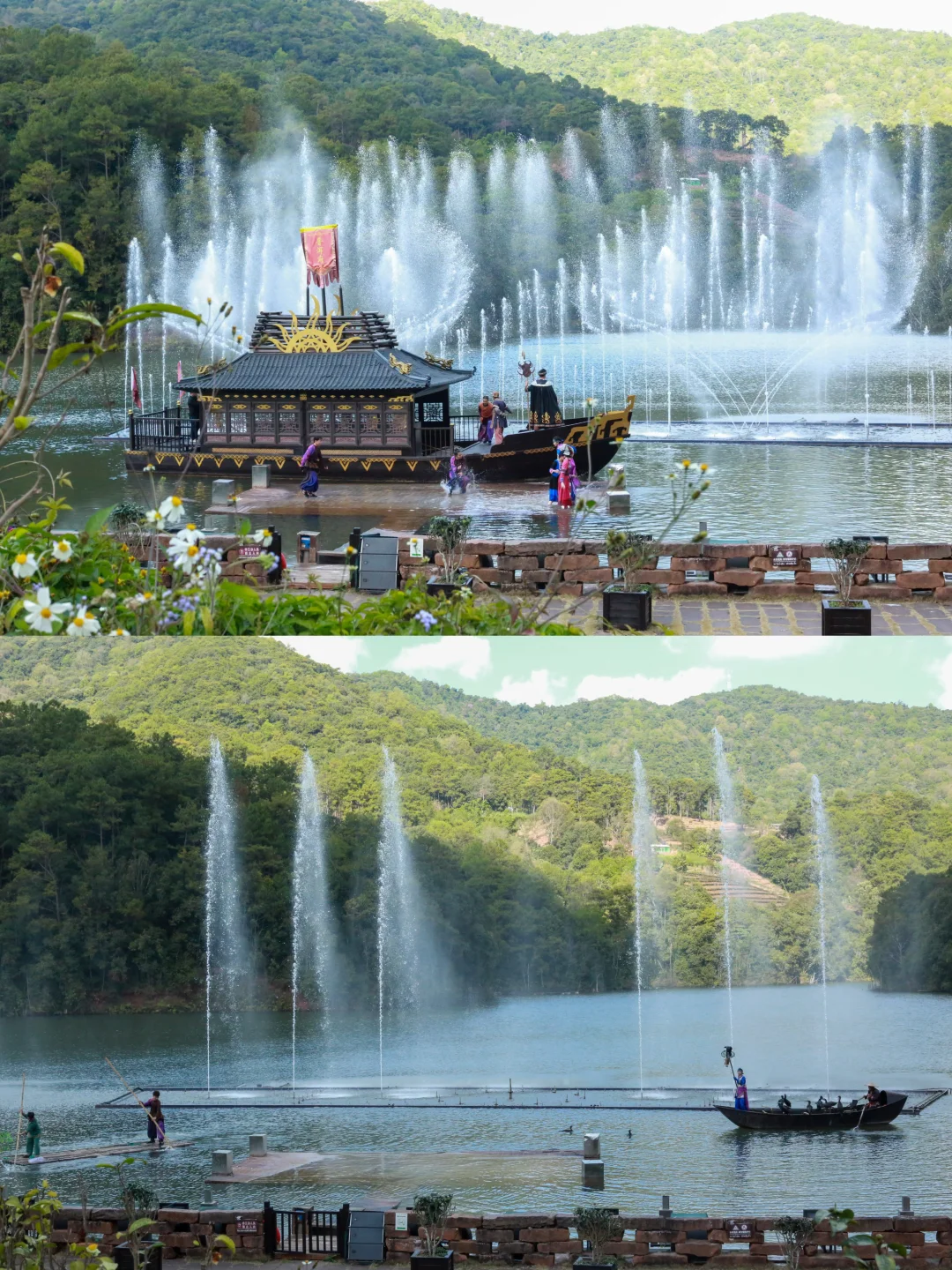 ✅定波湖广场:湖水清澈,周边景致迷人。大型实景水舞秀《马帮情歌》美轮美奂,将普洱茶马文化与少数民族风情完美融合。乘船游览,观赏鱼鹰抓鱼非遗技艺。漫步浮桥,来到定波湖畔的萌宠乐园与梅花鹿互动、骑行矮脚马,尽享亲子欢乐。