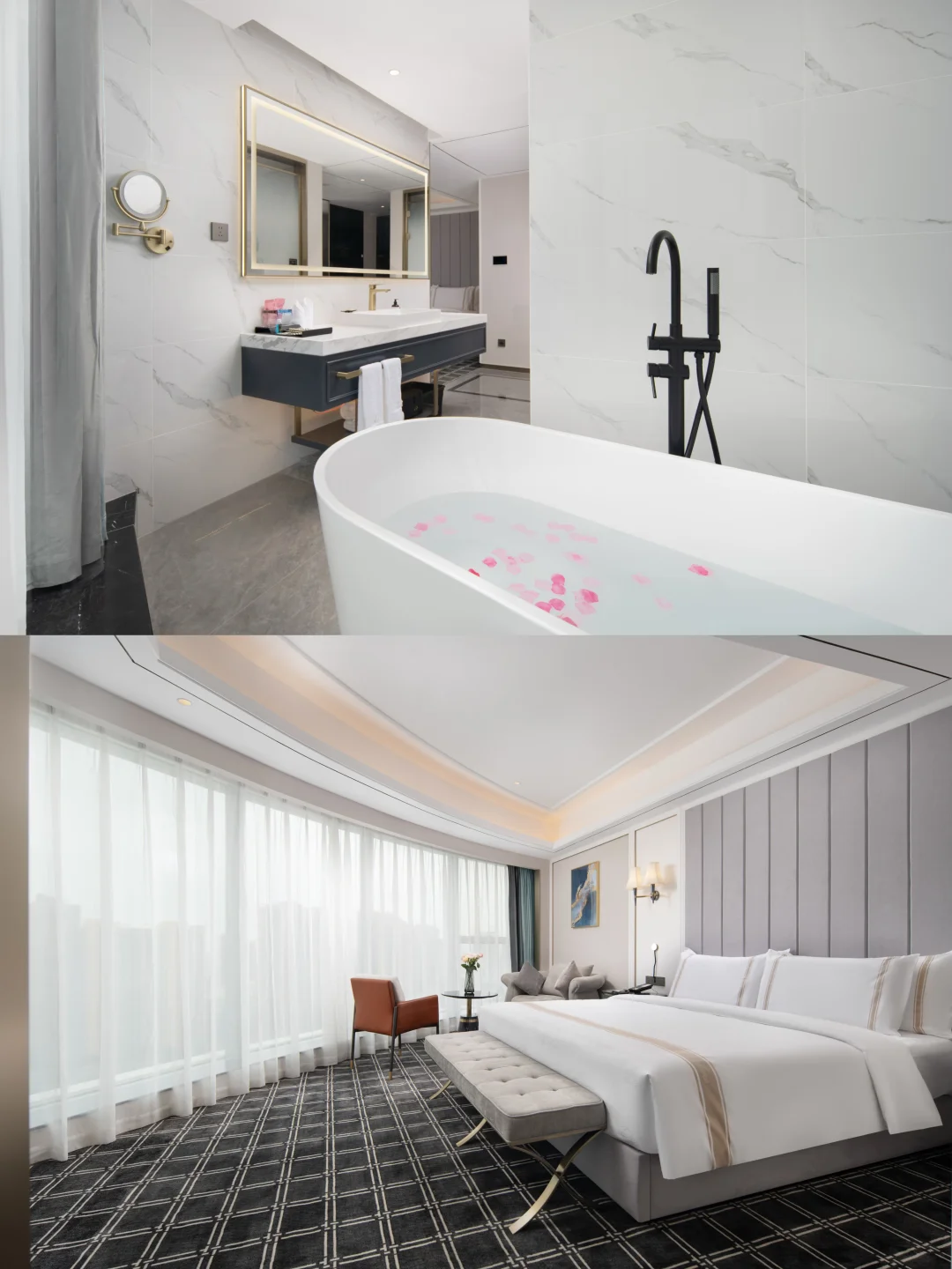是谁躺在浴缸里看游船划过江面我不说!\n这次挖到的宝藏酒店直接治好了我的城市疲惫症,推开窗就是星光坠落的西江夜景,闺蜜看了直呼要带28寸行李箱来长住!!\n.\n📍外海大桥旁这栋神似大鱼造型的建筑太抢眼啦!\n从大堂开始就疯狂拍照停不下来——蓝色波浪穹顶+金属线条灯光,整个空间像条大鱼在跳舞!大堂五大态度区域✨“水、倔、敢、变、Inevitable”涵盖阅读、茶饮、艺术打卡体验感超棒,拍照也很出片📸香水墙还可以DIY属于自己的香氛气味,本香水控当场调出\"江风茉莉\"味💫\n.\n🛌这次住的休闲大床房直接让我变成尖叫鸡!\n谁懂啊!!智能窗帘唰推开180°全景落地窗的瞬间,西江波光和中山古镇的璀璨灯火直接撞进眼底🌉70%的客房都是一线江景房,泡在浴缸里看江景,真的会恍惚自己悬浮在江面~最绝的是房间还是智能声控的,只要喊小度小度,就可以解放双手自由活动了✌\n简直就是“度假感天花板酒店”!\n房间还配有0压感床垫和洁癖友好的马桶消毒酒精棉片👍以及和浴缸配套的浴缸套和女生需要的免费面膜🉑用‼泡澡前先套上浴缸套,再撒点浴盐,感觉自己就是江上漂流的浪漫电影女主!💃\n.\n🌃27楼云端餐厅必须重点夸!\n牛排滋滋冒油,头顶智能灯光还能自由切换氛围,很适合烛光晚餐🍽当江面倒映的霓虹开始流动时,突然理解闺蜜那句\"好像塞纳河烛光晚餐\"——此刻应该响起《La Vie En Rose》才对!\n.\n✨酒店还配有免费洗衣房、健身房、KTV、棋牌室全都有,想躺平想嗨玩都能满足~\n🚶♀️周边步行5分钟到城央绿廊,晨跑时江风会亲吻发梢\n📸彩虹村建议下午四点去,马卡龙色房子配夕阳绝美\n🍜三十三墟街的老字号猪脚面必吃!猪脚超糯,胶原蛋白拉满\n⛩茶庵古寺求了事业签,在千年菩提树下突然就静下心了\n.\n🏨江门外海希岸酒店\n📍江门市江海区外海临江路38号(外海大桥旁)\n