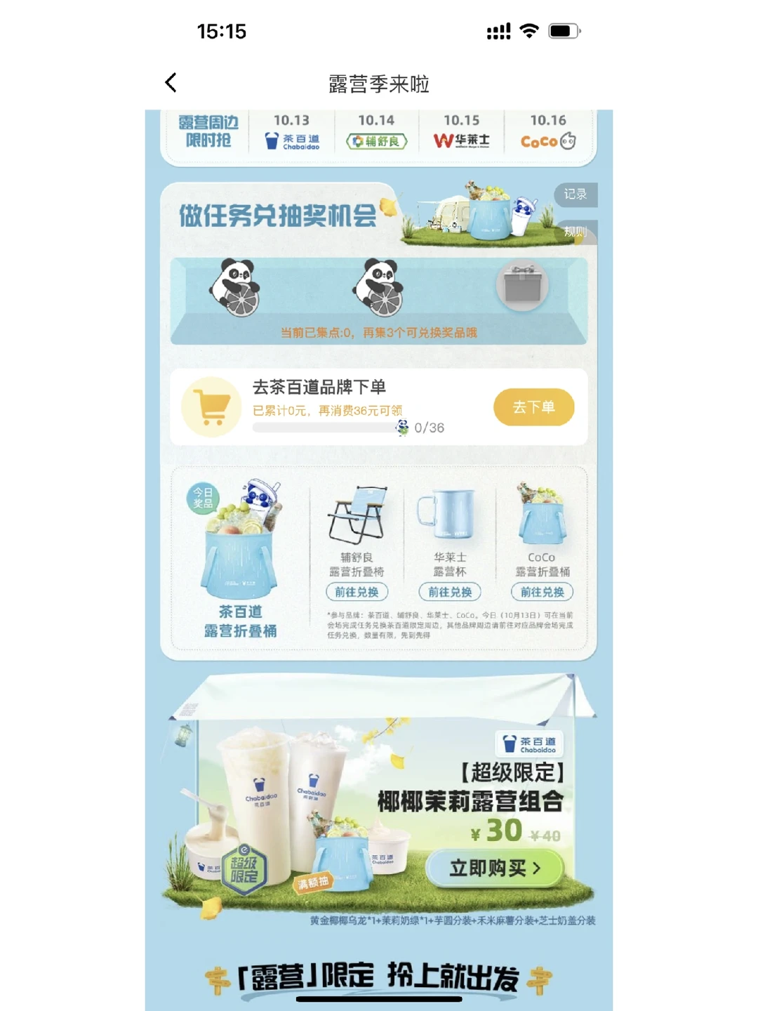 👉👉椰椰茉莉露营组合:黄金椰椰乌龙*1+茉莉奶绿*1+芋圆分装+禾米麻薯分装+芝士奶盖分装,大杯,活动价30元,指定套餐7.5折起,满额还能抽奖获得一个茶百道露营桶!