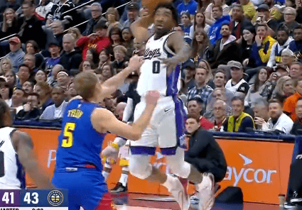 第二节比赛中,德罗赞反击送出妙传,蒙克拉满弓上演战斧劈扣。