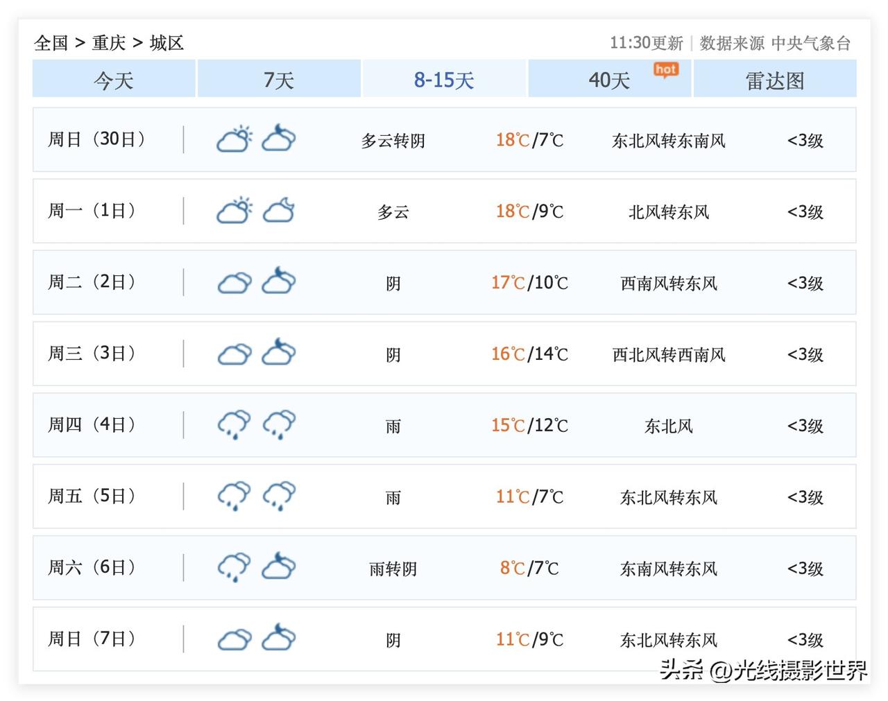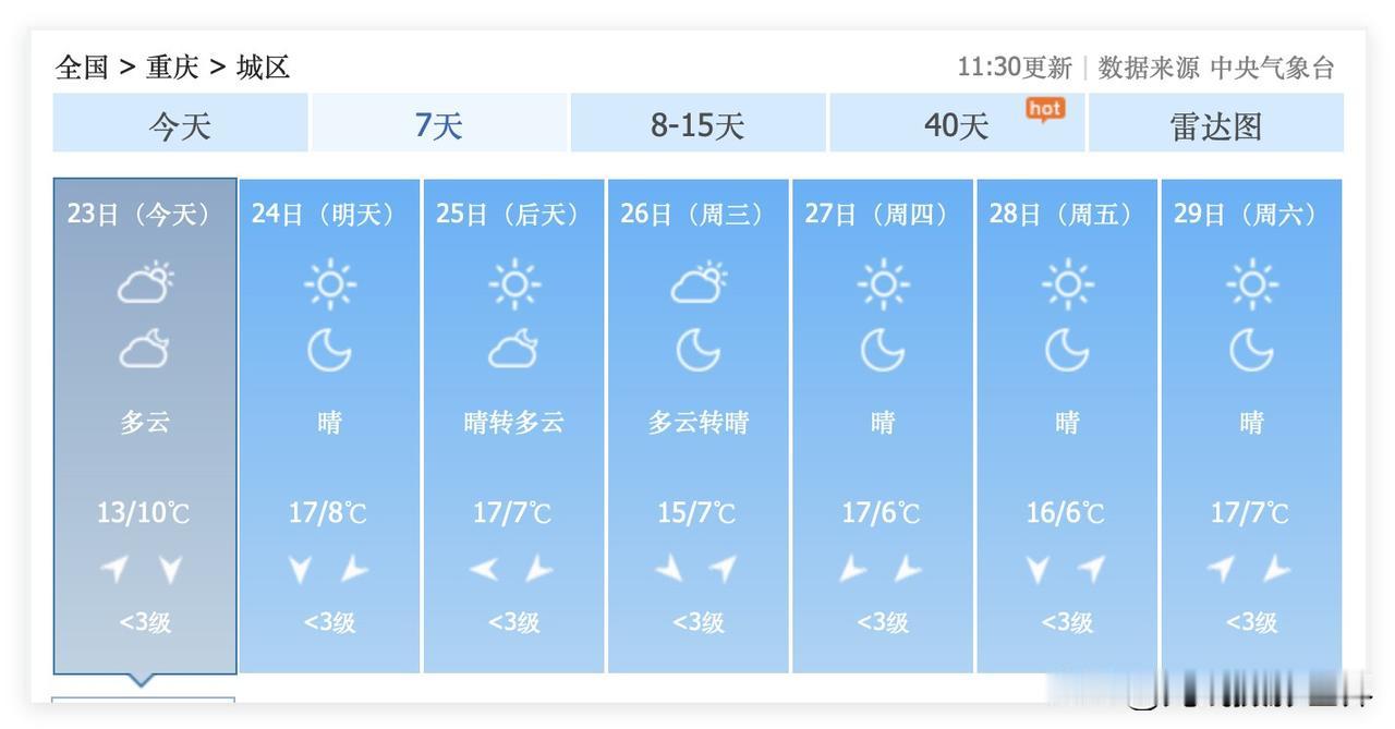 噢!11月23日,重庆金佛山和仙女山都下雪啦!但是,11月24日,重庆又要出太阳啦!11月24日到12月1日,重庆每天都带大太阳,太棒了吧?!冬天的重庆,一下子这么多个连续的晴日,还是让重庆人特别感动和激动啊! 11月24日,星期一,如果重庆出大太阳,那可就是过年啊!