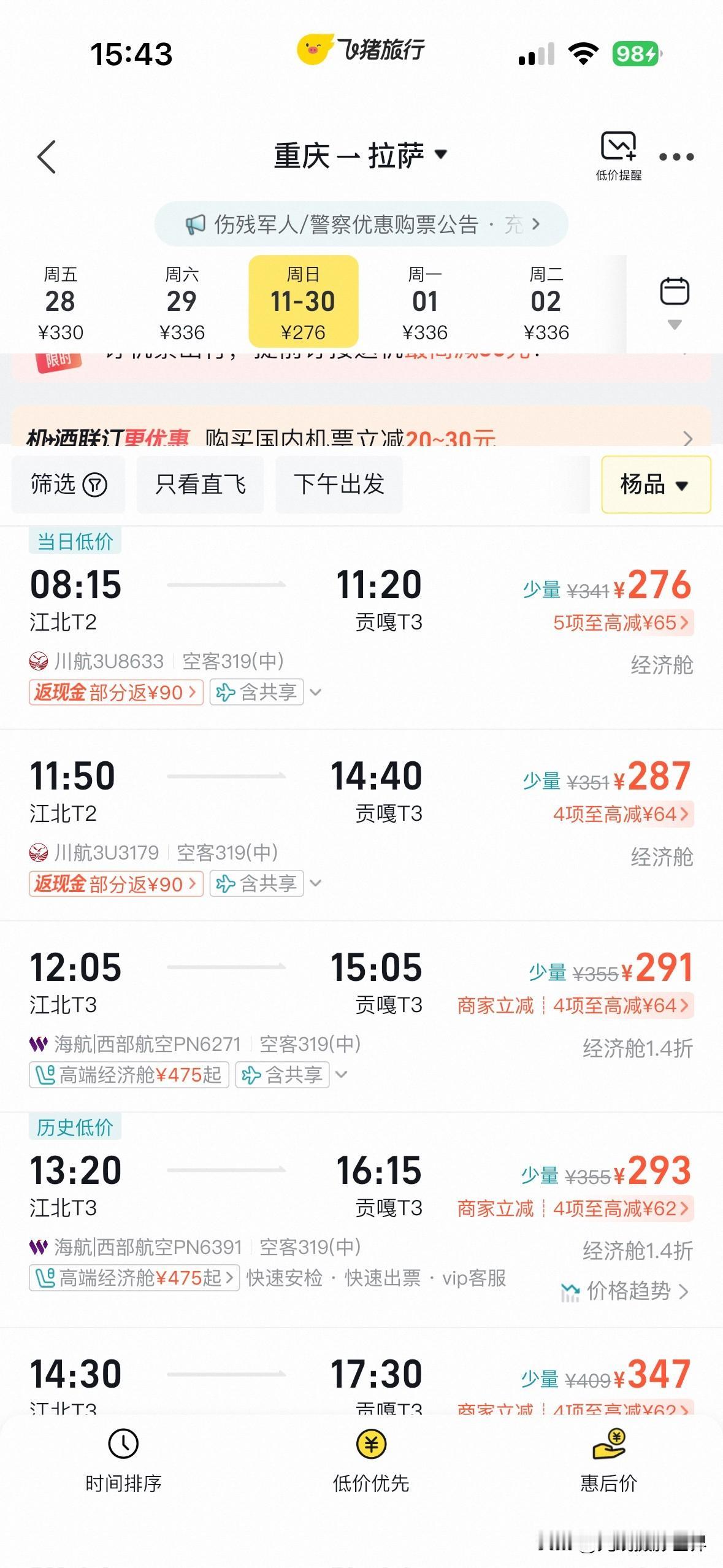 未来三天,重庆成都飞拉萨的飞机的窗外,大范围大雪纷飞!所以,11月26日开始,重庆飞拉萨的飞机,窗外的风景,秒杀大多数5A级别风景区!飞机窗外的连绵千里的雪山,贡嘎雪山,梅里雪山……啊啊啊!真的是太壮观了! 尤其是连续几天的大雪之后,连绵千里的雪山将会更加的壮观啊! 重庆人,成都人,最近,飞拉萨的机票特别便宜!拉萨到西宁兰州广州上海重庆成都的火车票,卧铺,随便买,不用抢啊!