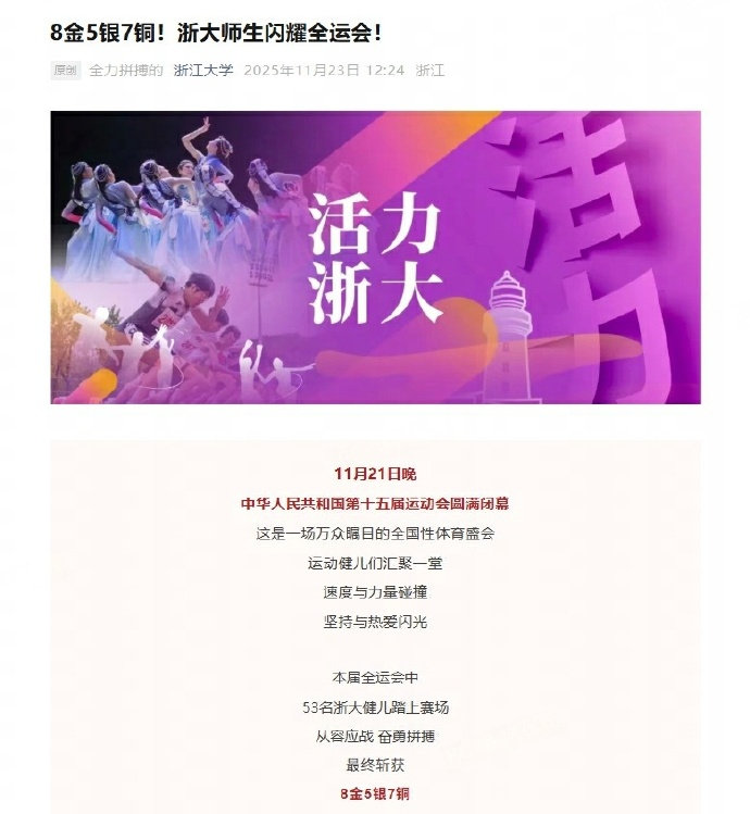 十五运圆满落幕,浙江大学发文《8金5银7铜!浙大师生闪耀全运会!》,祝贺刘诗雯勇夺全运会乒乓球混合双打金牌。刘诗雯为浙江大学教育学院2025级体育教育训练学博士研究生。本届全运会中,53名浙大健儿踏上赛场从容应战,奋勇拼搏最终斩获8金5银7铜。同时浙大教师积极投身赛事服务工作,以专业担当助力盛会顺利举办。