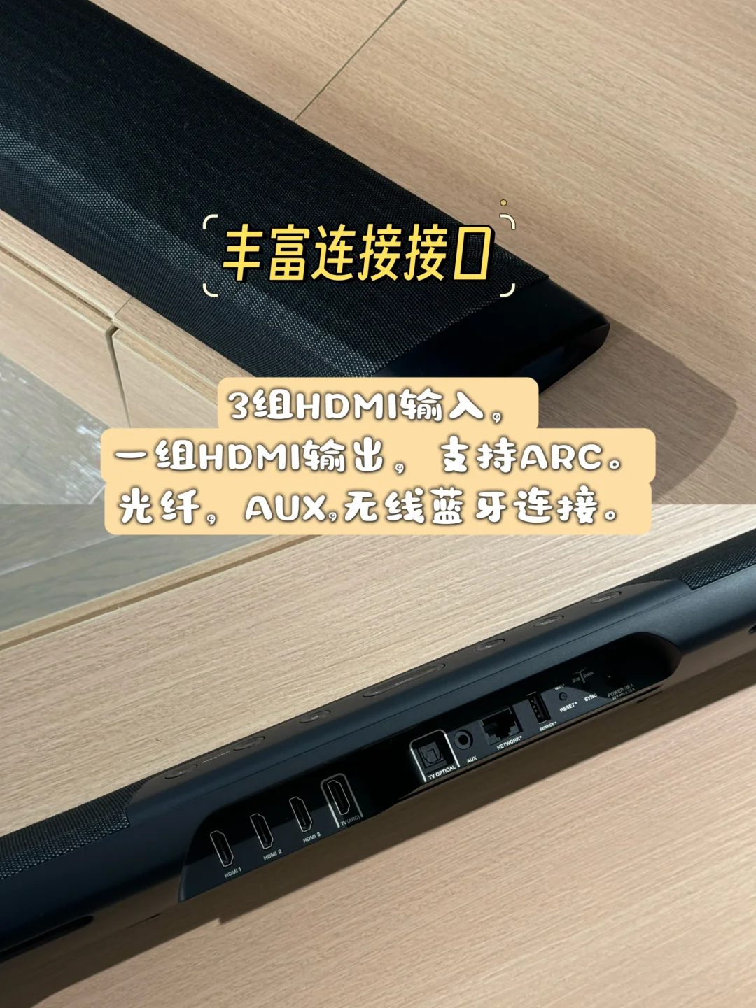 普乐之声 MAX SR 音响回音壁的连接方式极其便捷,让您无需繁琐的布线和复杂的设置,就能轻松畅享高品质的娱乐体验。无线低音炮和无线后环绕音箱只需插上电源,即可与条形音箱自动配对连接,省去了您走线的烦恼。其背部丰富的接口,包括 3 进 1 出的 HDMI 接口组、光纤接口、AUX 接口以及网络端口等,能够满足您多种设备的连接需求。无论是连接电视、游戏机、蓝光播放器还是各种盒子,都能轻松应对,让您的娱乐世界更加丰富。