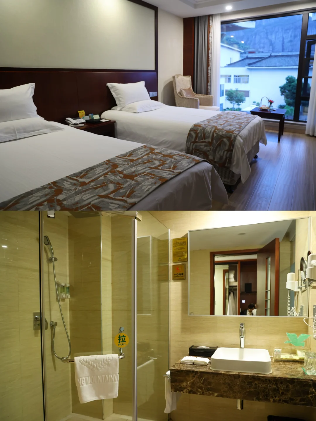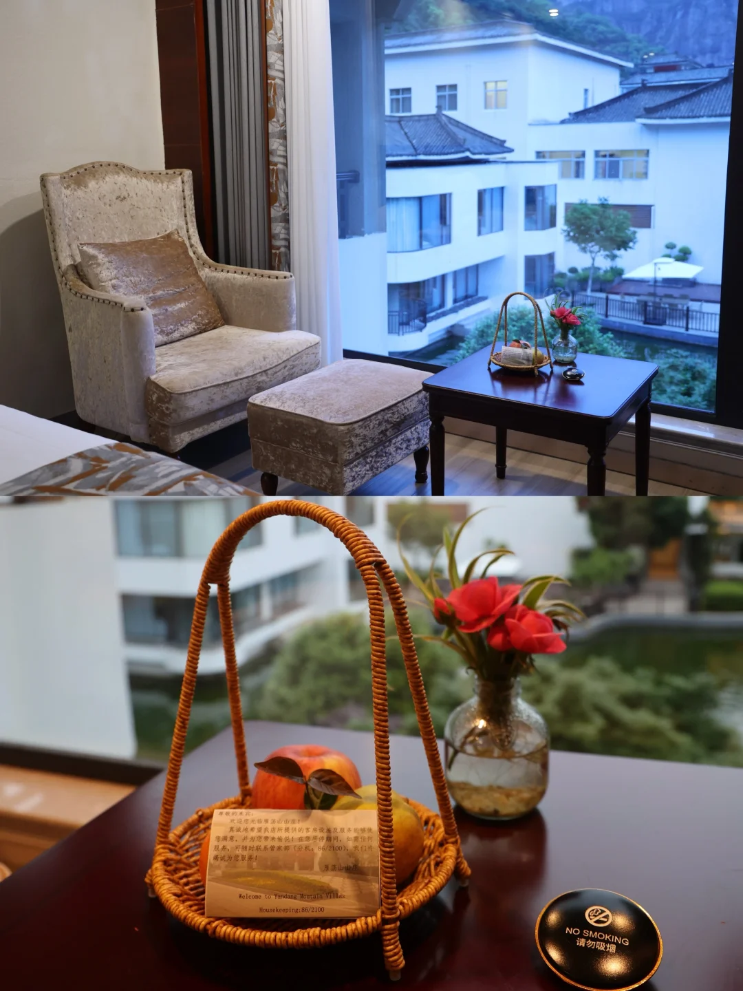 🏠走进豪华标间,里面设施一应俱全,落地玻璃窗外,是青绿的中式庭院🏡和碧波荡漾的湖水,尽情呈现大自然的秀美景色。酒店更是用心为您准备了欢迎水果,细节之处彰显着对客人的呵护之意。