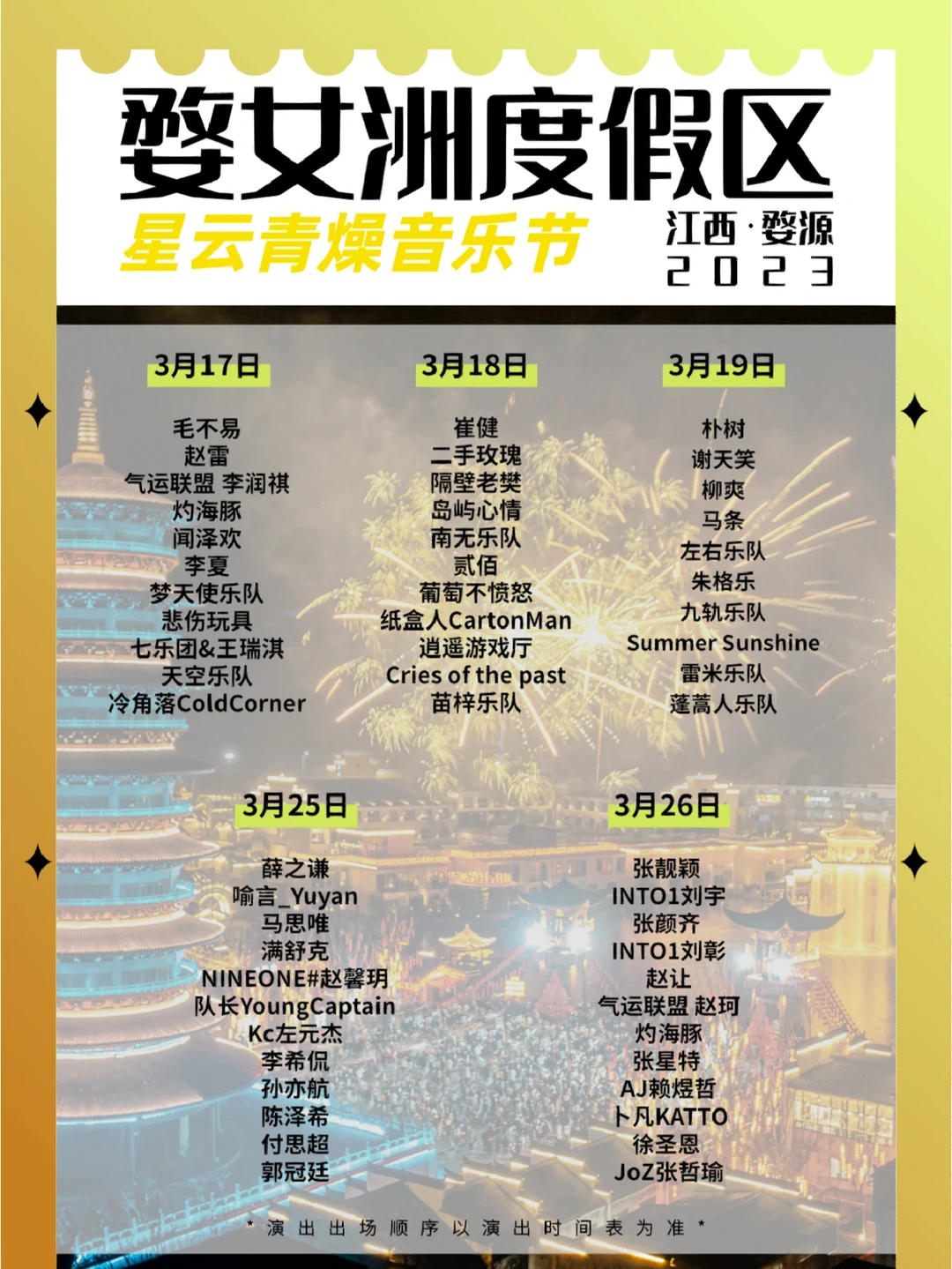 3月17日-19日,3月25日-26日期间,将举办两场婺女洲星云青燥音乐节,5天50+组乐队阵容,燥动这个春天!喜欢音乐的你记得提前购票哦!