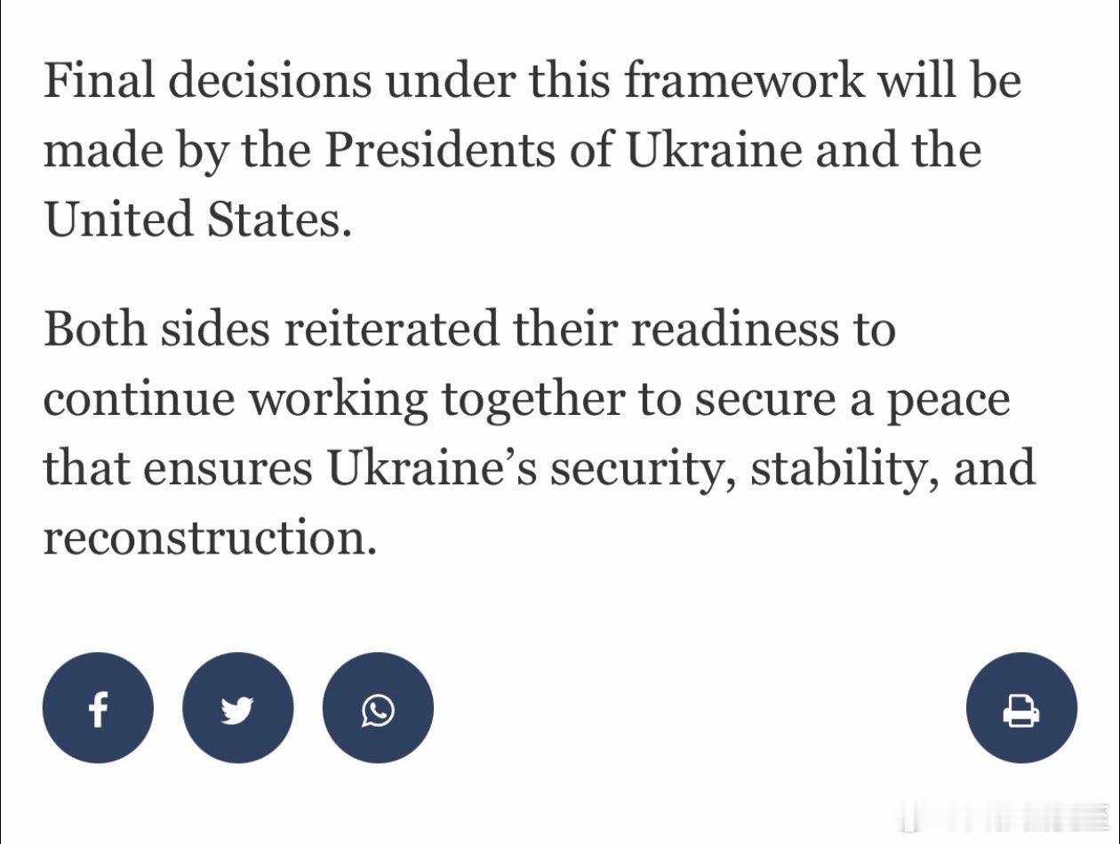 美乌发表联合声明,要点:双方有诚意、会谈有成效必须维护乌克兰的主权、必须实现公正持久的和平双方拟定了新的“和平框架”乌方感谢美国、感谢川总美乌谈判继续进行、会与欧洲保持密切联络框架内容,需双方总统批准