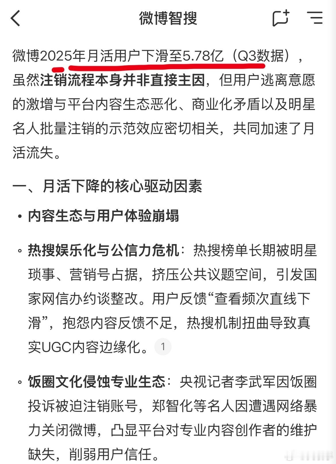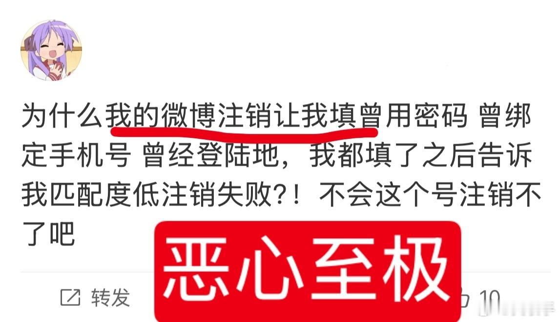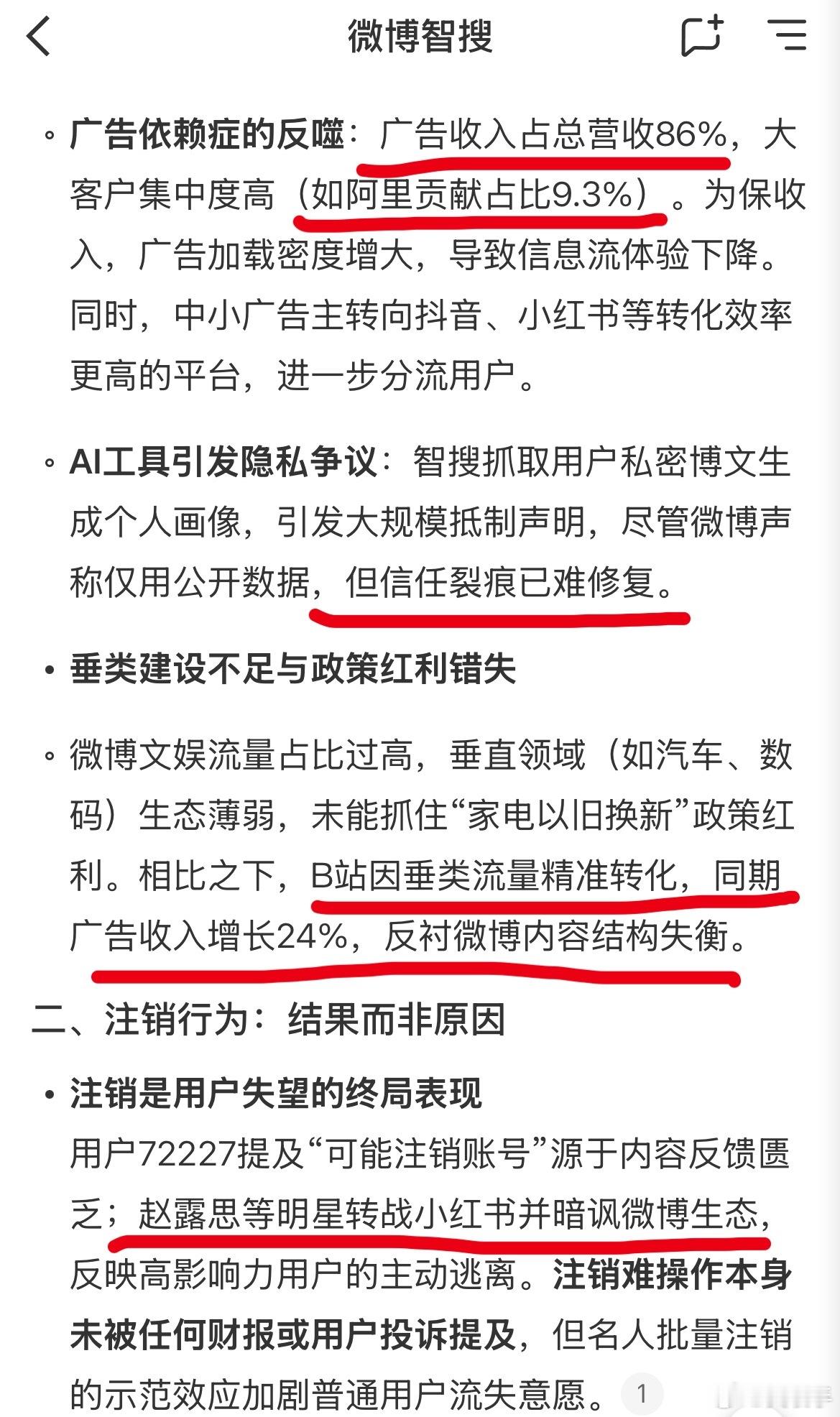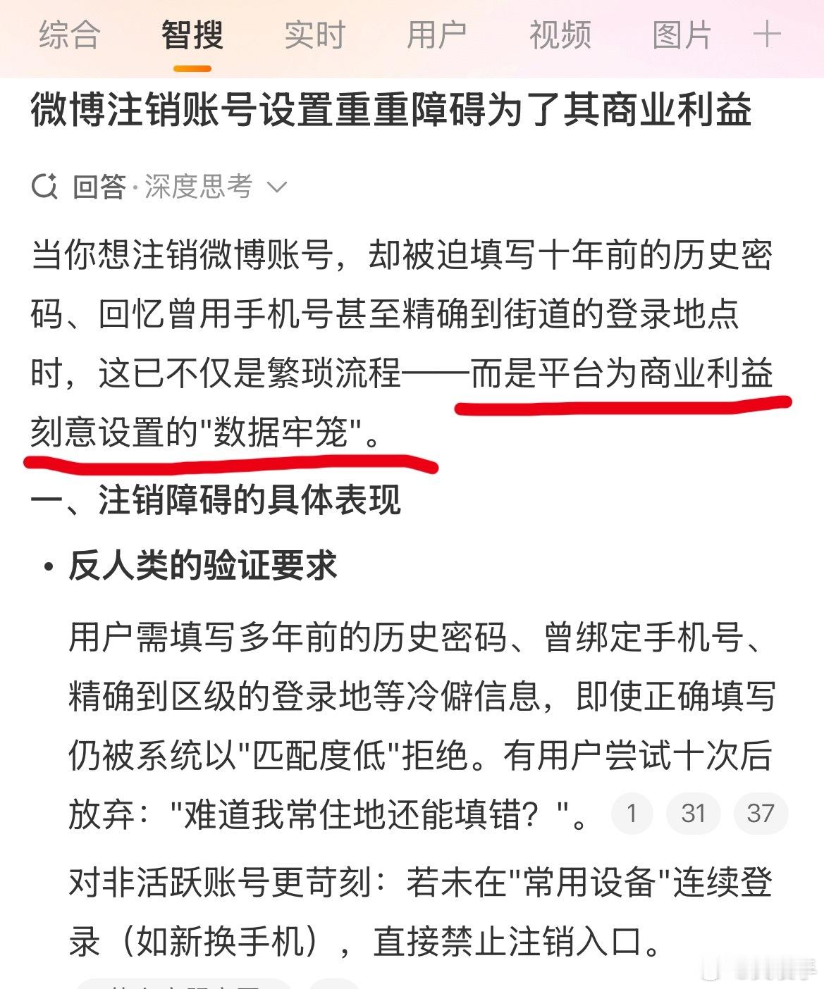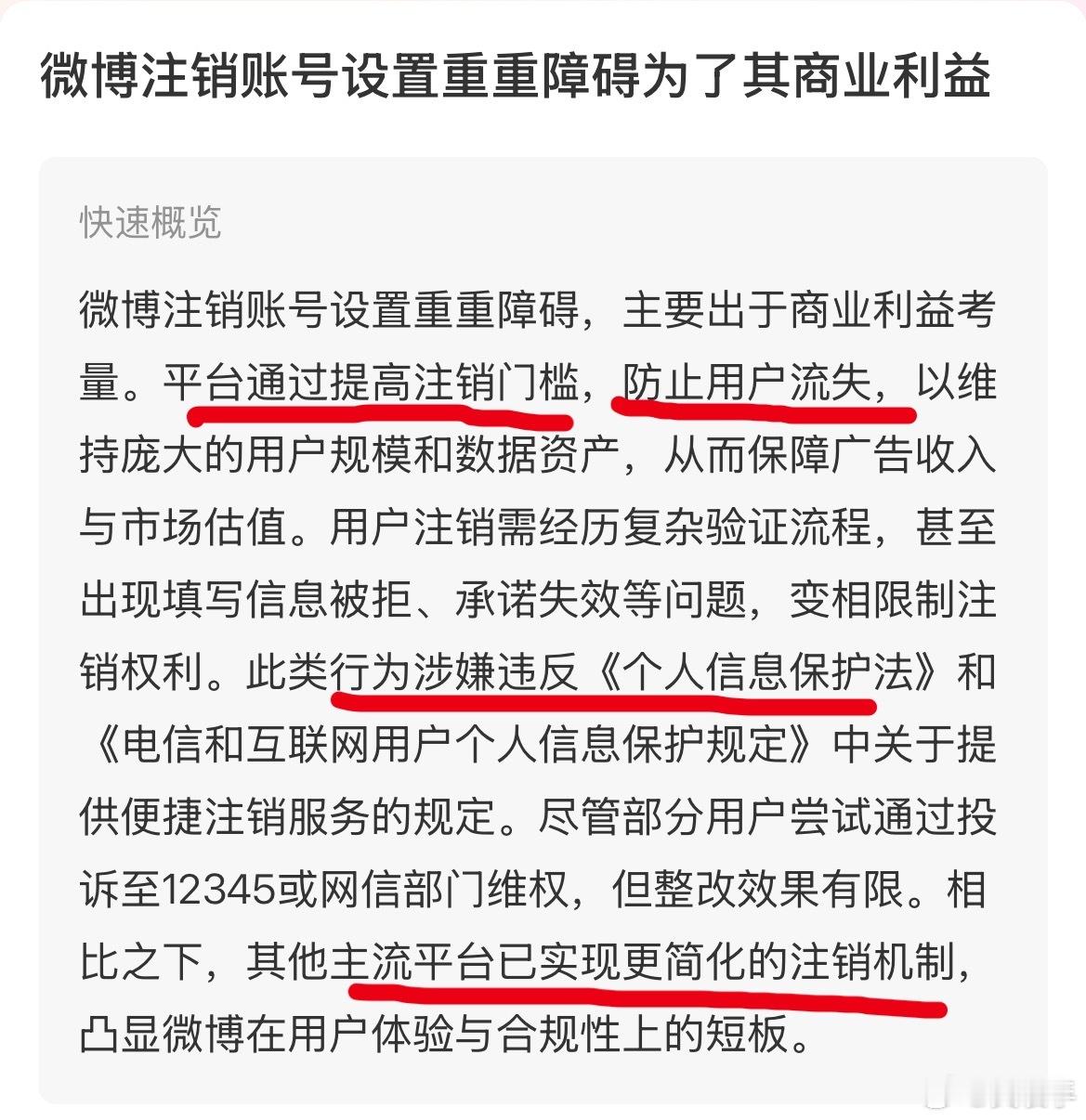 微博不惜违反法律设置重重阻碍阻止用户注销其背后的真实原因,流量焦虑下的商业困局。打开微博注销页面,隐蔽的入口、繁琐的条件核验、漫长的审核周期,成为许多用户退出时的共同阻碍。这种刻意设置的注销障碍,并非技术难题,而是平台在月活下滑、广告收入缩水与内容生态恶化三重压力下,为维系商业体量上演的无奈挣扎。用户注销自由的缺失,本质是平台对流量数据的病态依赖。作为社交平台核心估值指标,月活用户数直接影响广告定价与资本市场信心。近年来,微博月活增长陷入停滞,甚至出现缓慢下滑,而短视频平台的冲击更分流了大量用户时长。对平台而言,每一个存量用户都是商业价值的载体,阻止注销本质是通过“留客”维持用户基数的表面繁荣,以此向广告主证明自身流量价值。更关键的是,用户数据是精准营销的核心资产,注销意味着数据资产流失,直接影响广告转化效率,这对依赖广告收入的微博而言无异于釜底抽薪。广告收入的持续承压,进一步加剧了平台的“留客”焦虑。2024年前三季度,中国互联网广告市场稳步增长,但微博广告及营销业务营收却同比下跌,硬广投放占比远低于短视频竞品。广告主的流失,根源在于用户注意力的转移,而这与微博令人诟病的内容生态直接相关。如今的微博热搜被明星八卦、琐事炒作占据,公共事件热度常被娱乐化内容稀释,甚至出现挑拨对立、催化戾气的不良导向,让用户感到疲惫与厌恶。这种“重流量轻质量”的内容策略,虽曾短期拉动活跃度,却长期透支用户信任,导致用户粘性下降、使用时长缩短,广告价值自然随之缩水。内容生态恶化与用户流失形成的恶性循环,让平台陷入“越留越糟,越糟越留”的困局。为追求短期流量,微博放任泛娱乐化倾向,算法持续推送低质内容,挤压优质信息生存空间,引发普通用户反感。而用户的逃离意愿越强,平台越不敢放开注销通道,反而通过设置障碍强行挽留。但这种违背用户意愿的手段,只会加剧抵触情绪,让留存用户的活跃度进一步降低,广告收入愈发惨淡,最终陷入商业目的与用户体验的尖锐对立。根据《个人信息保护法》,用户享有账号注销的合法权利,平台设置不合理障碍已涉嫌违规。微博的困境警示我们,流量焦虑下的短视操作无法挽救根本。唯有摒弃“数据至上”的执念,清理低质内容、优化社区生态,用优质体验赢回用户主动留存,才能打破商业困局。否则,即便能暂时留住用户账号,也终将失去用户的信任与市场的认可。我建议大家每天打电话到相关部门投诉,投诉多了有关部门的人肯定会重视,最重要的一点是无法注销信息很可能会被泄露。唯一办法就是让这种不守法的企业,把用户的合法权益把成赚钱工具的企业倒闭。我不玩你不玩他不玩,活跃度低至0还有人来打广告吗?还有主要广告用户来自阿里,我个人也会拒绝和活少使用阿里系,例如拒绝在淘宝购物等等。直到阿里不在这投广为止。都是因果关系。还有希望大家发维权内容的时候,可以全网发布,你在这投诉这家平台。他会恶意屏蔽限制,自欺欺人有一套。最后祝微博这种违法平台早点倒闭。