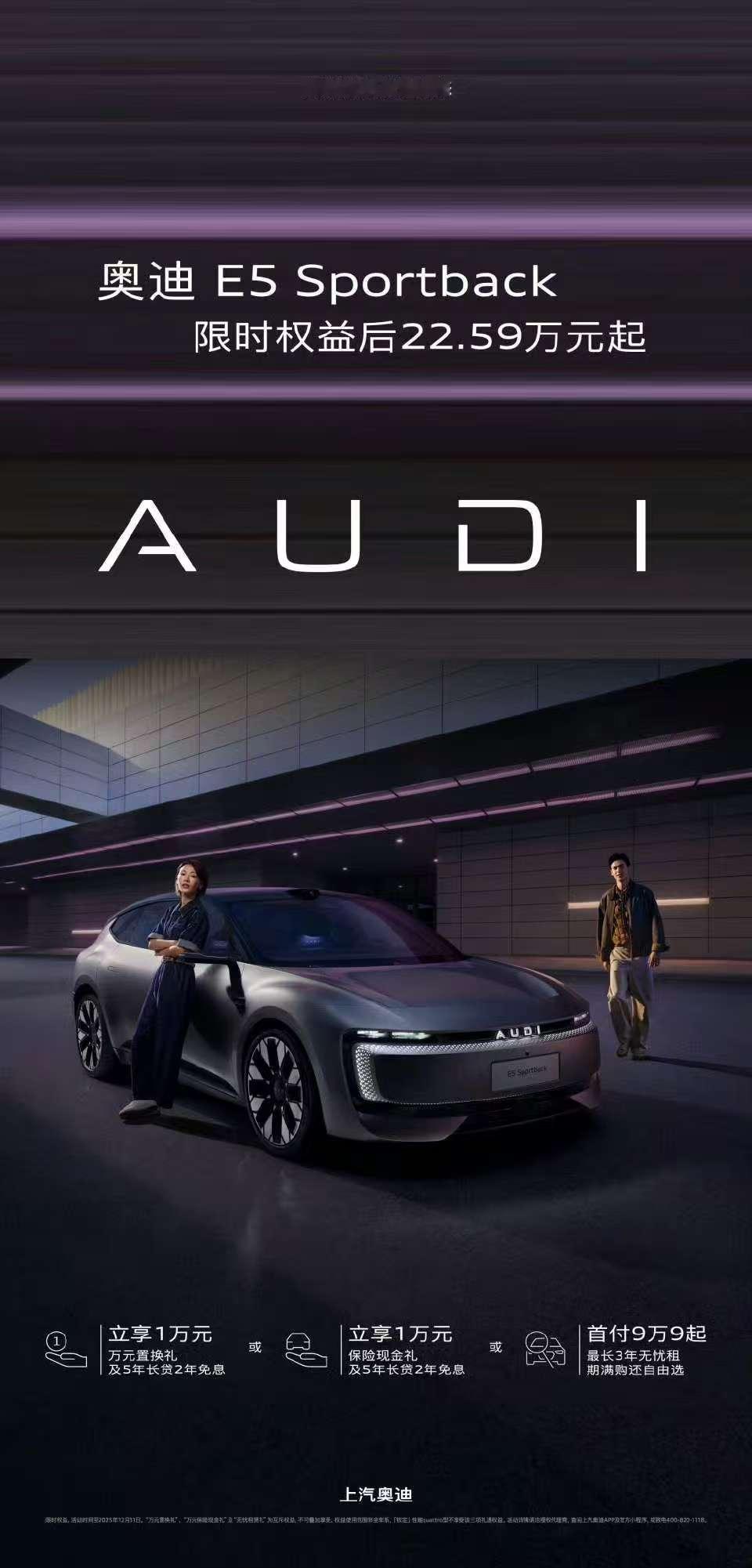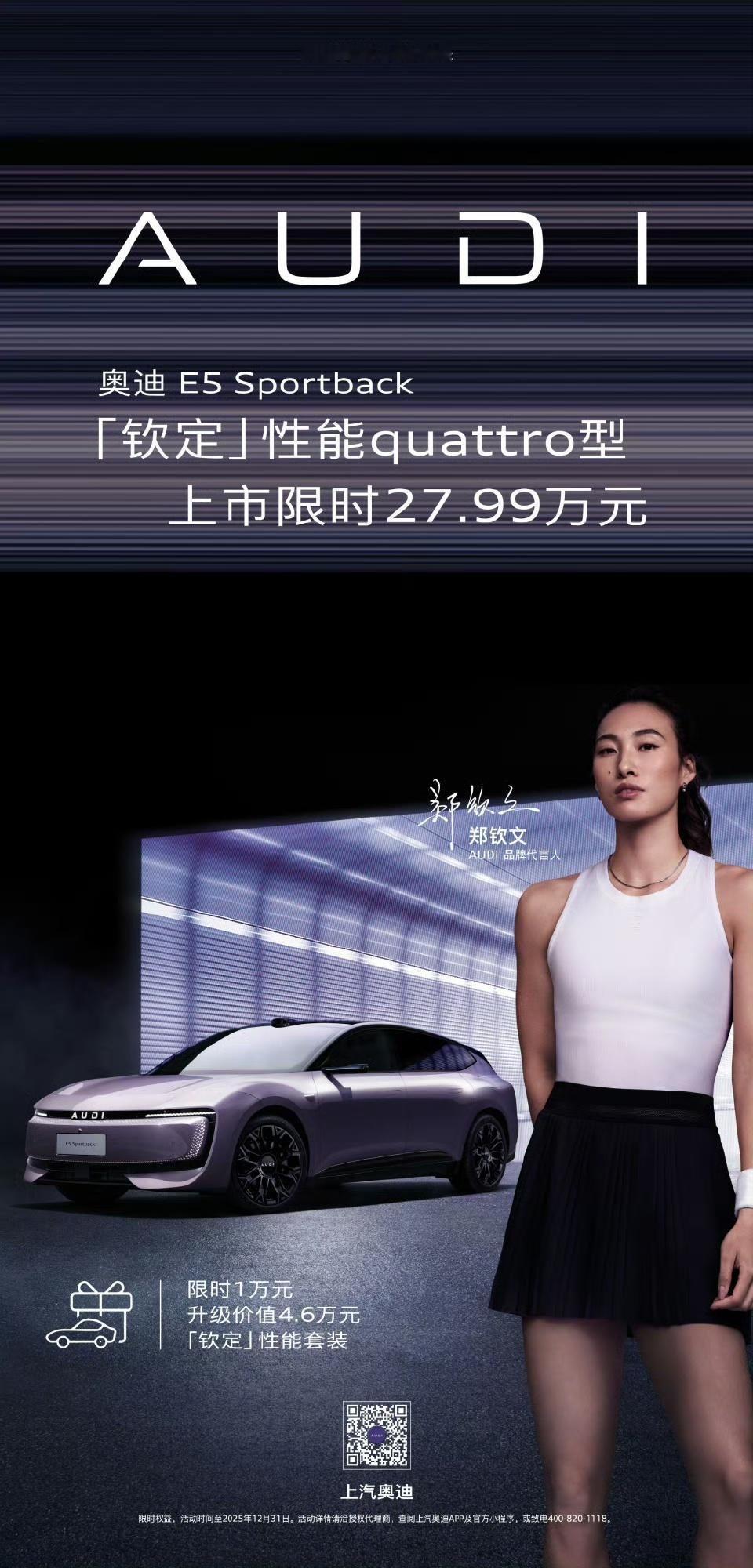 谁能想到,豪华品牌也会在性价比赛道杀疯!广州车展亮相的奥迪E5钦定版,直接打破了性能与实惠不可兼得的固有认知!27.99万的限时价,20寸轮毂+285性能胎、CDC+空悬+后轮转向的操控三件套,再加上BOSE音响、前后排座椅舒适功能,这些以往只在50万级车型出现的配置,如今1万就能打包升级!奥迪E5钦定版的quattro四驱系统,让它既能精准切弯,又能稳控各种路况,对比同级别车型ET5T,不仅操控更优,价格还低1万多全系22.59万起的入门价,更是把豪华门槛拉到新低:标配59时广域屏、激光雷达和Momentta高阶辅助驾驶,20多万就能享一线豪华品牌的技术与配置!从性能到舒适,从价格到配置,奥迪E5这波操作,算是把豪华电车的性价比天花板给焊得死死的!