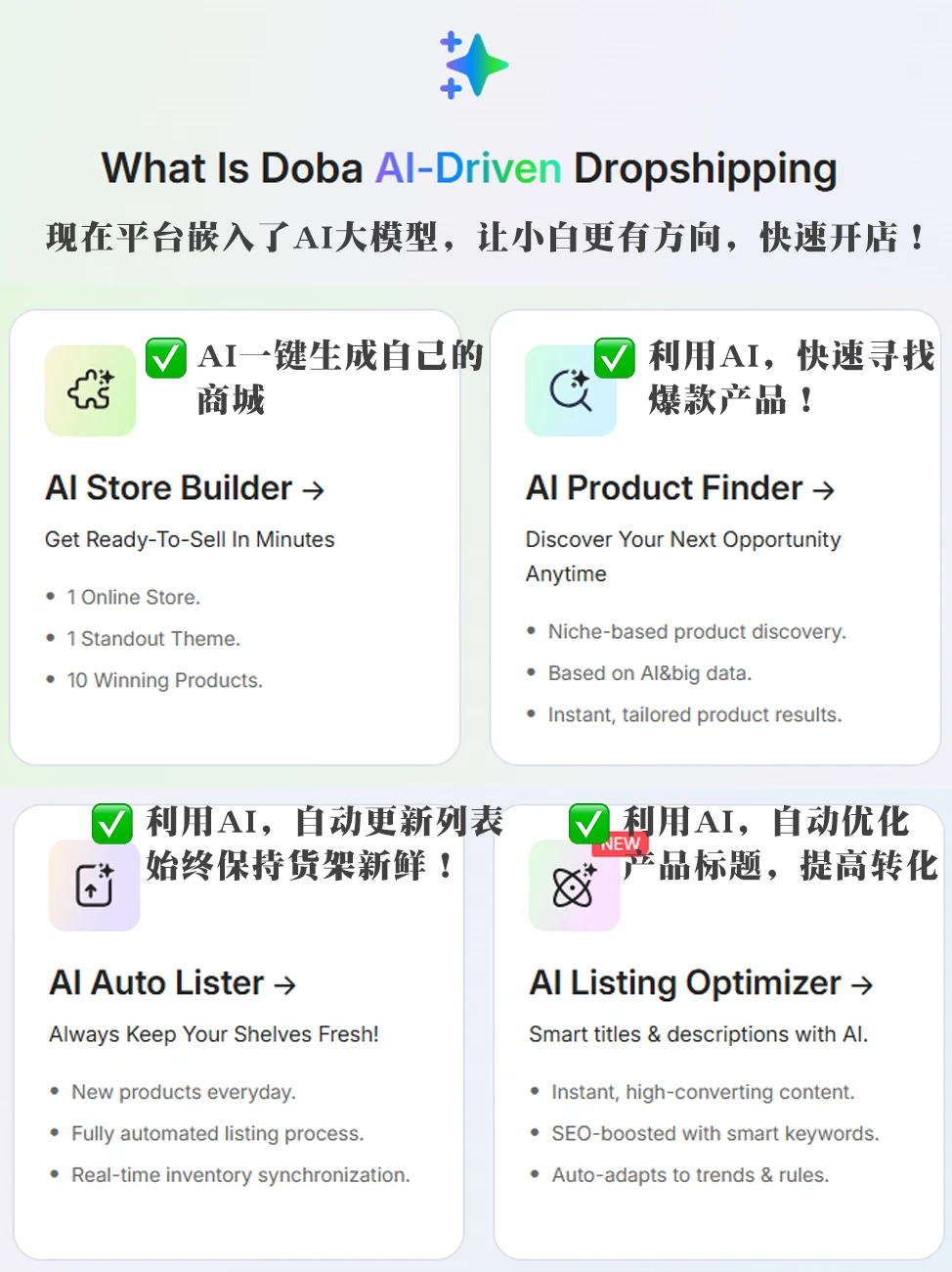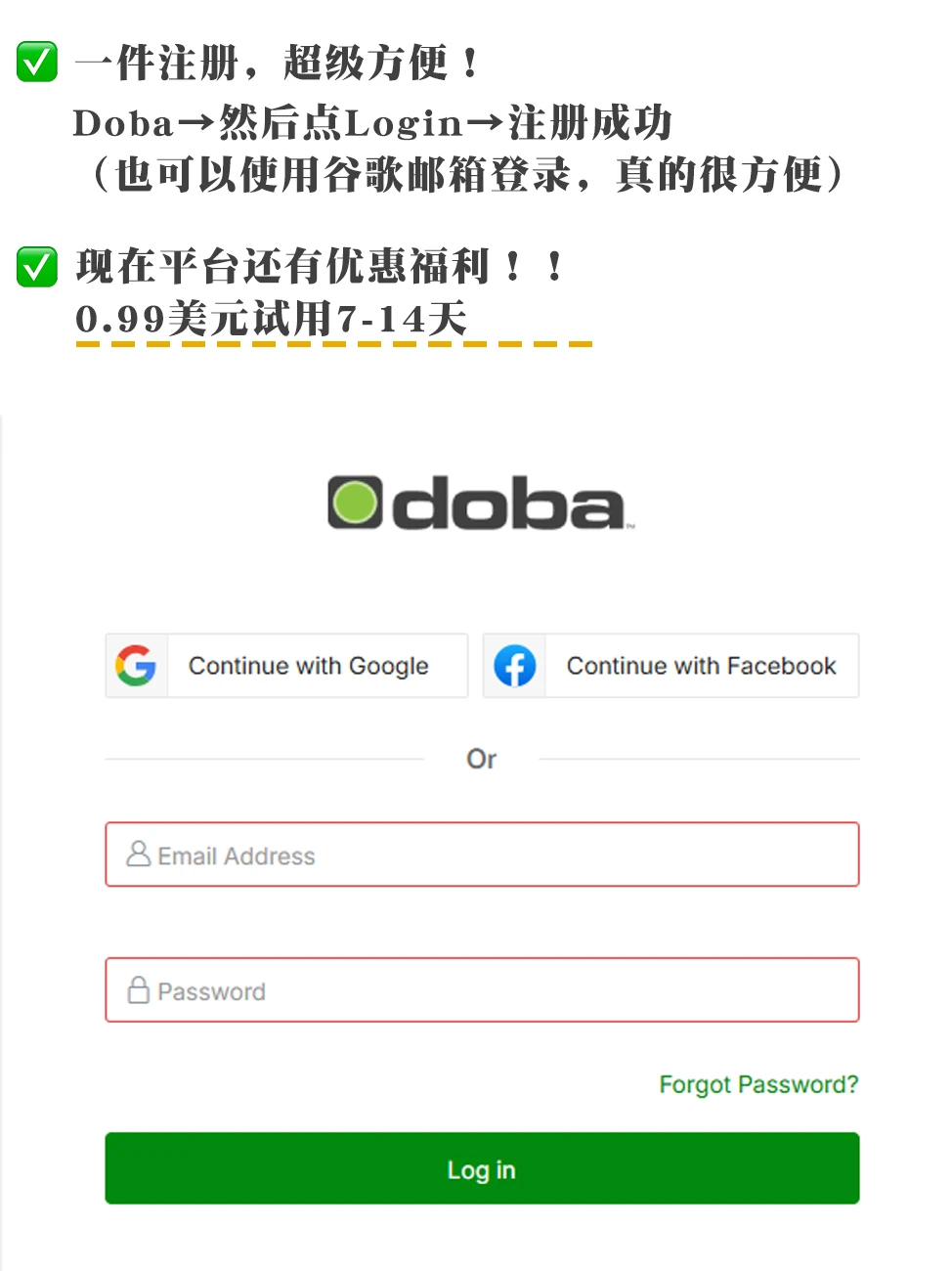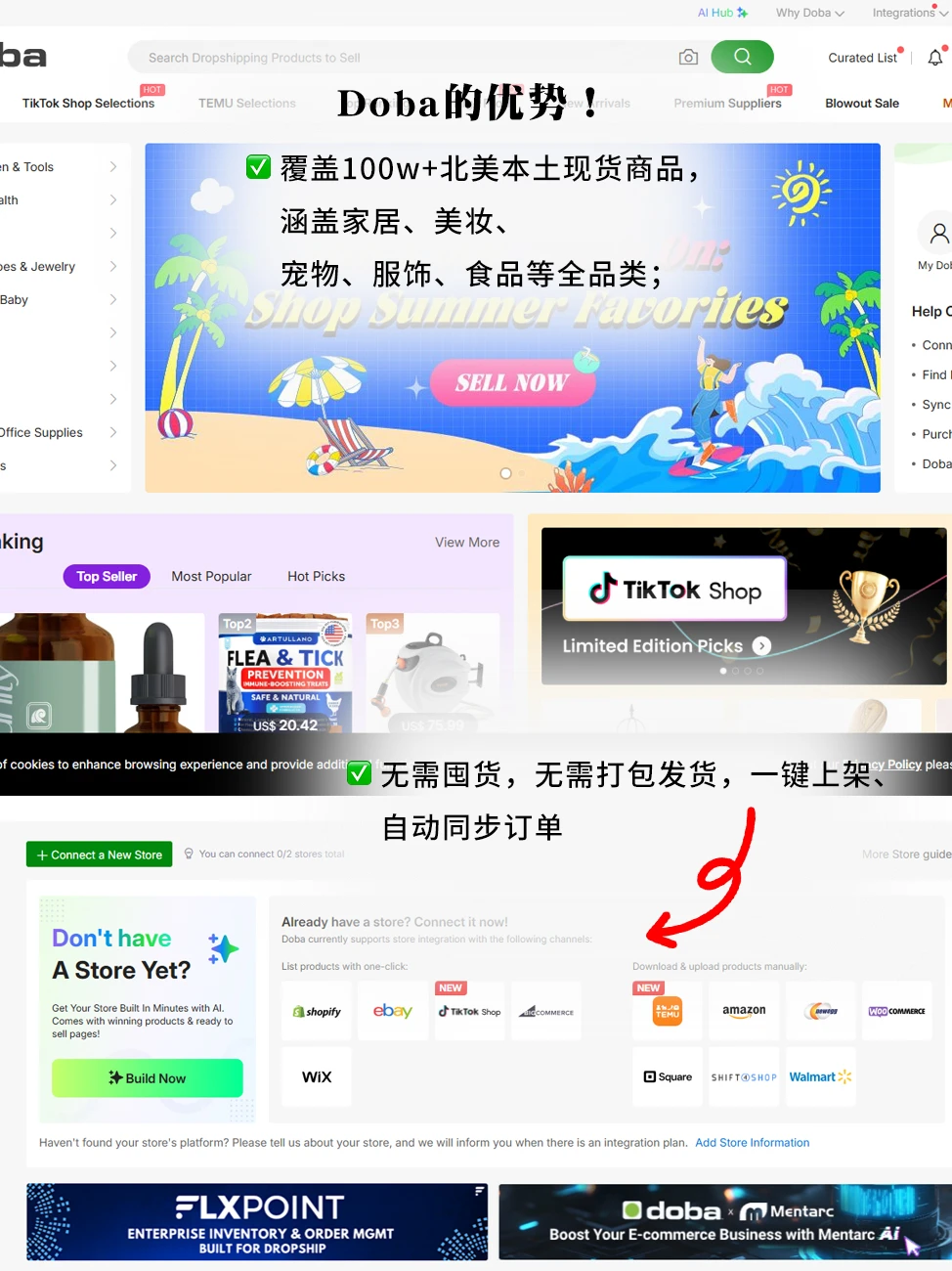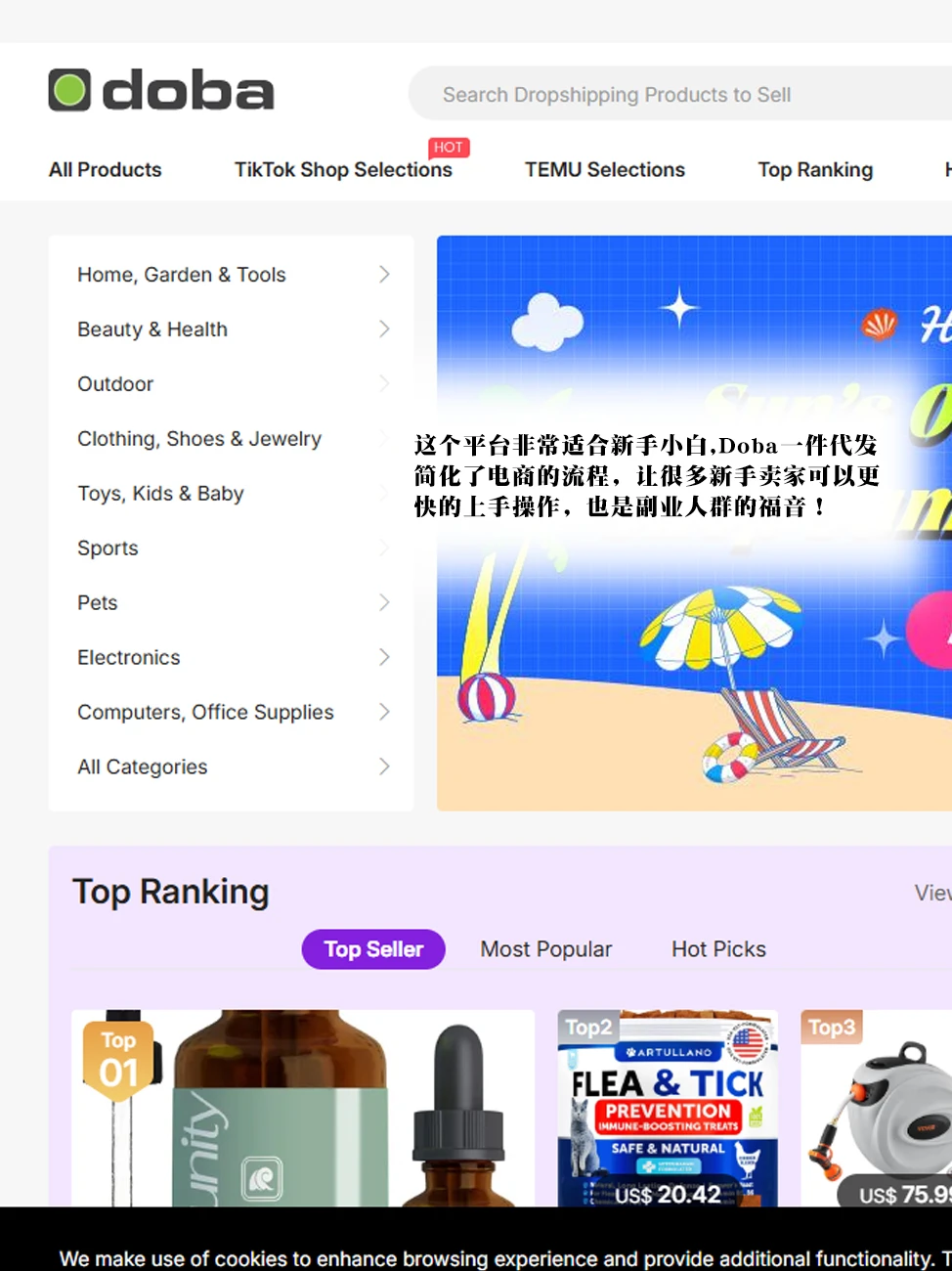 这几年陆陆续续很多小伙伴想用闲暇时间做点副业,张张也推荐了很多了。但是结合副业效果和结果来看,跨境电商还是最有搞头的!\n原因:①市场够大②客户多③平台多,流量多\n\t\n最近跟一个好久没见的朋友聊天,发现了打破我认知的事情:朋友大学毕业不想卷了干脆回老家接了个月薪3k的工作,本来我们都以为他彻底躺平过上清汤寡水的日子了,结果他竟然悄悄在做跨境电商,收入比我一个在大城市打三份工天天想着搞钱的人还高!\n后来我忍不住好奇问了好多问题,发现关键步比我想象的容易,火速记录本人的偷师经验:\n\t\n做Doba步骤如下:\n第一步:注册\n点\"login注册账号也可以使用谷歌邮箱登录 \" 0.99美元试用7-14天\n·\n第二步:选品抄作业\n做任何事情都要学费模仿,很多爆款都是原本产品就有热度,所以要学会“跟风”\n可以利用AI选品工具,快速筛选高曝光高销量的产品。然后综合分析,最后选出优质的产品上架。\n目前几大热门品类:宠物类目(一直都是非常火爆的),瑜伽裤,户外用品\n第三步:一键上架\n之前很多平台都是自己手动一个个上架,或者使用第三方软件上架产品,要么效率慢,要么要额外收费还有不兼容。现在Doba可以一键一键批量上架商品,不需要再手动采集或者用ERP\n第四步:运营\n老美下单 →订单自动回传 Doba完成下单\n考虑做美区的小伙伴,这个平台真的可以冲,因为很多小伙伴已经试过了,我身边的人亲测结果也是非常不错的,订单量还是比较稳定的。最后祝小伙伴们通通爆单!\n\t\n