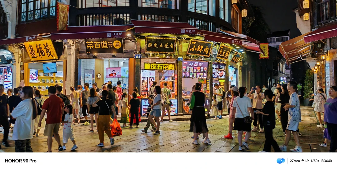 来感受一下荣耀90Pro大底主摄的随手拍,好看吗?我的直观感受是2个字:靓丽。白天的红墙红绿草绿,美食更有食欲,夜晚的街道夜景清晰,高光不散,画面感也是不错的。